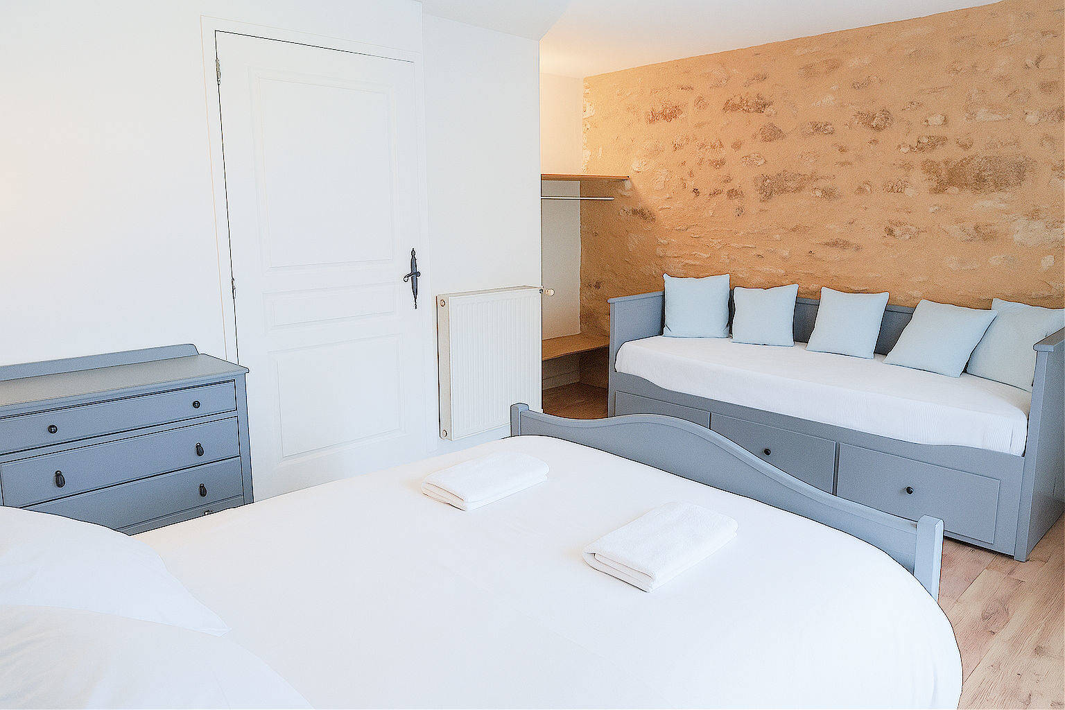 Via een sfeervolle stenen boog bereik je de slaapkamer met natuurstenen muur en comfortabel tweepersoonsbed (140x190). De en-suite badkamer beschikt over een ruime, toegankelijke inloopdouche en toilet. Op aanvraag kan een extra bedbank (90x190) worden klaargezet, ideaal voor een kind.