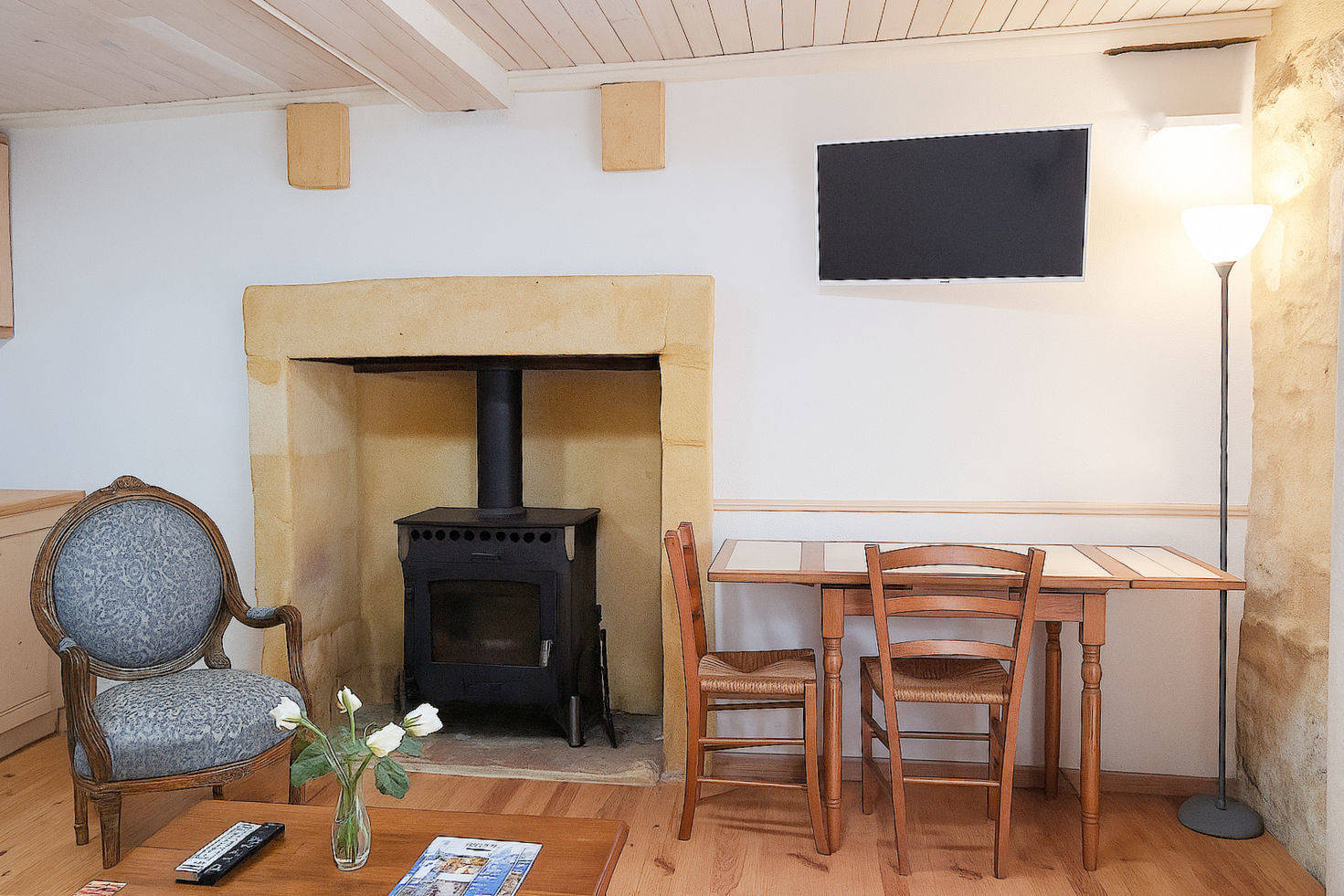 De entree met openslaande deuren verbindt de lichte woonkamer met de tuin. Binnen vind je een gezellige zithoek met houtkachel voor de koelere maanden en een televisie met Franse en Engelse zenders.