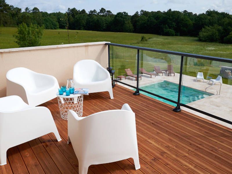 Via de openslaande deuren naar een balkon met uitzicht op het zwembad, de gastentuin en het weiland. Het uitzicht vanuit deze ruimte is prachtig in de vroege ochtend met de opkomende zon boven de velden en bossen. Er is een eettafel met stoelen voor zes personen, evenals lage zitplaatsen om overdag te ontspannen.