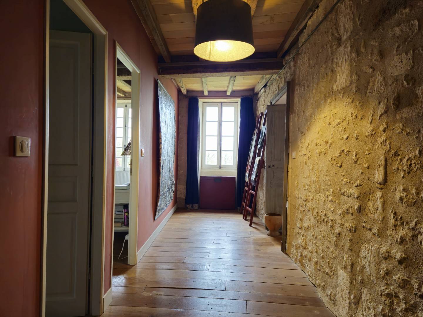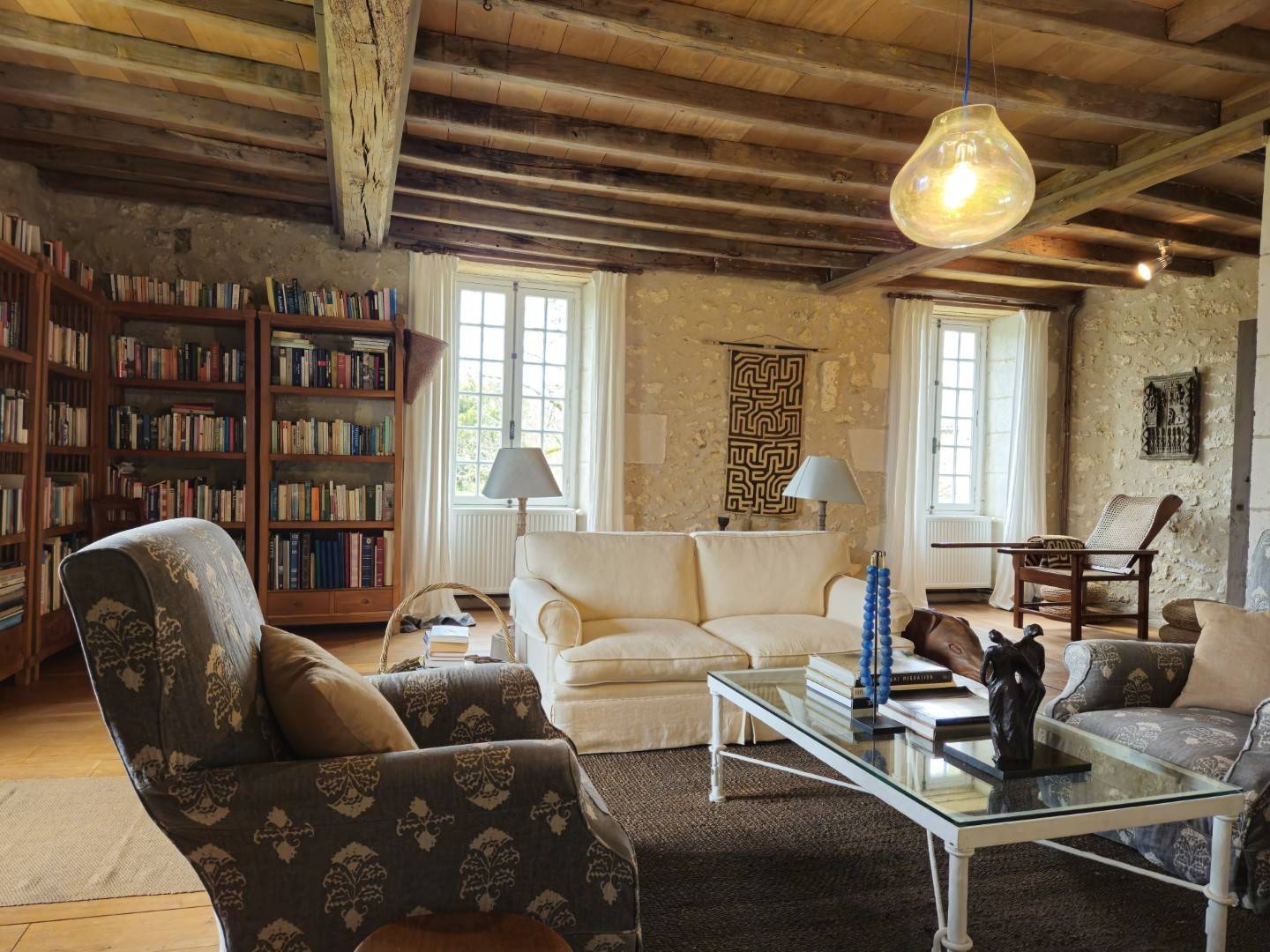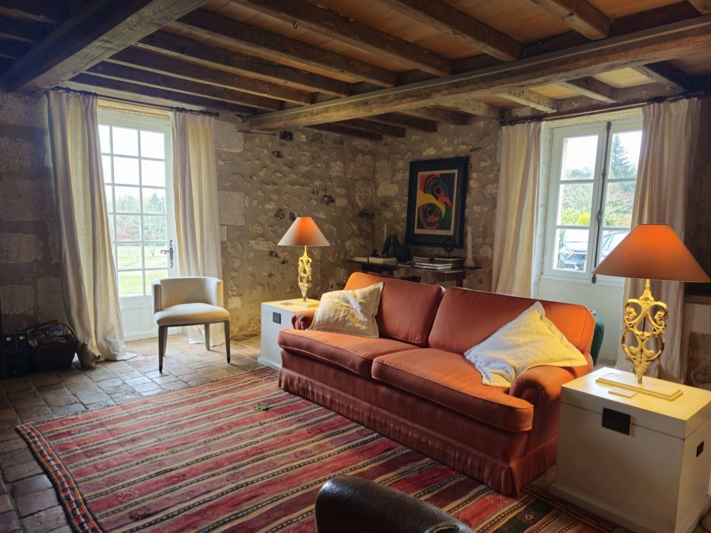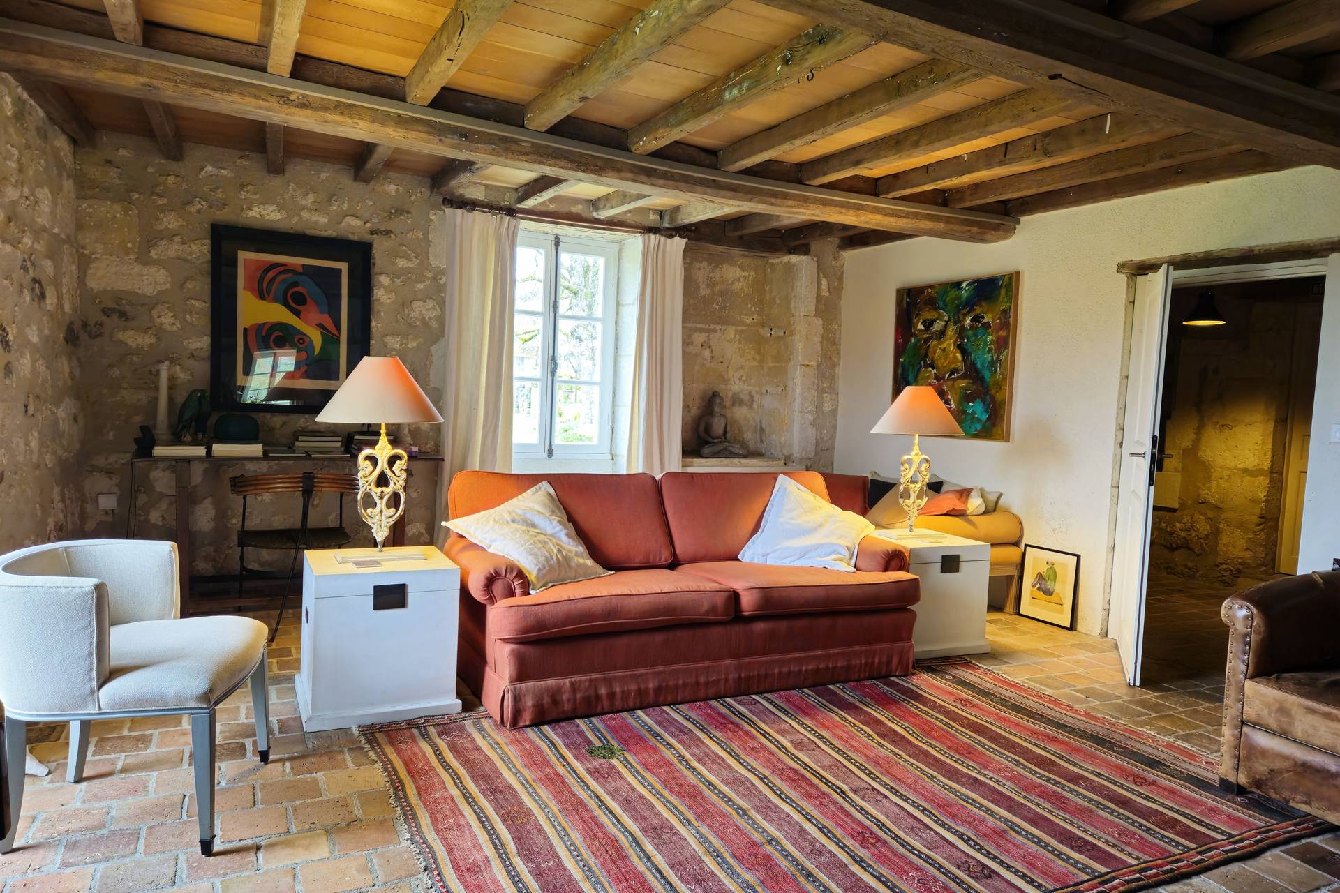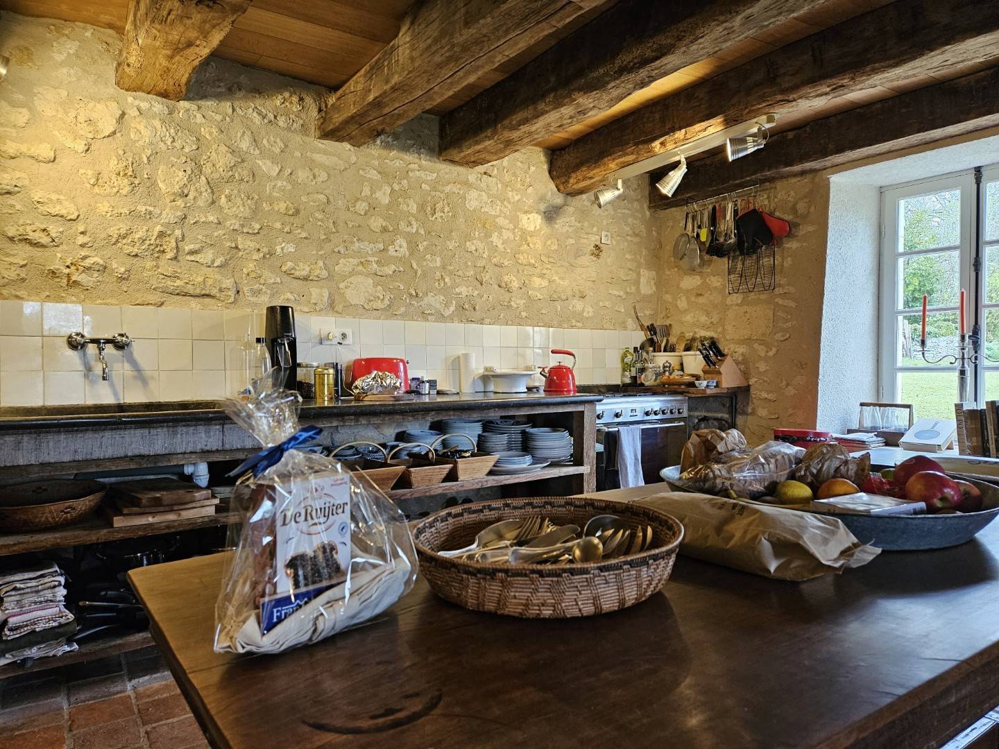 Binnen treft u een smaakvol en huiselijk interieur, harmonieus afgestemd op de natuurlijke omgeving. Het 450 m² grote Maison de Maître beschikt over een ruime, sfeervolle eetkeuken (6m x 9m) met een Belgisch blauwstenen aanrecht en een grote eettafel – ideaal voor lange, gezellige diners. De comfortabele woonkamer, met een centrale open haard, nodigt uit tot knusse avonden bij het haardvuur.