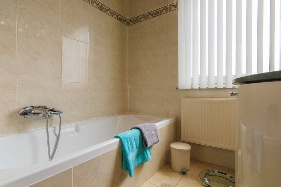 Slaapkamer 1 (begane grond) – tweepersoonsbed + eenpersoonsbed, badkamer met ligbad, wastafel en toilet