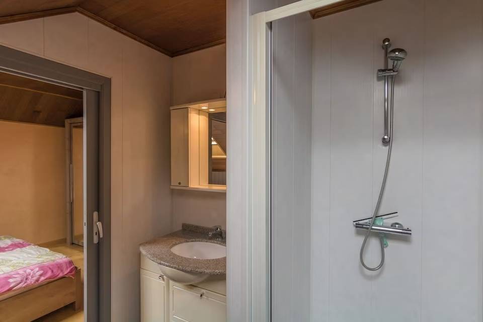 Slaapkamer 2 (1e etage) – tweepersoonsbed + eenpersoonsbed, badkamer met douche, wastafel en toilet