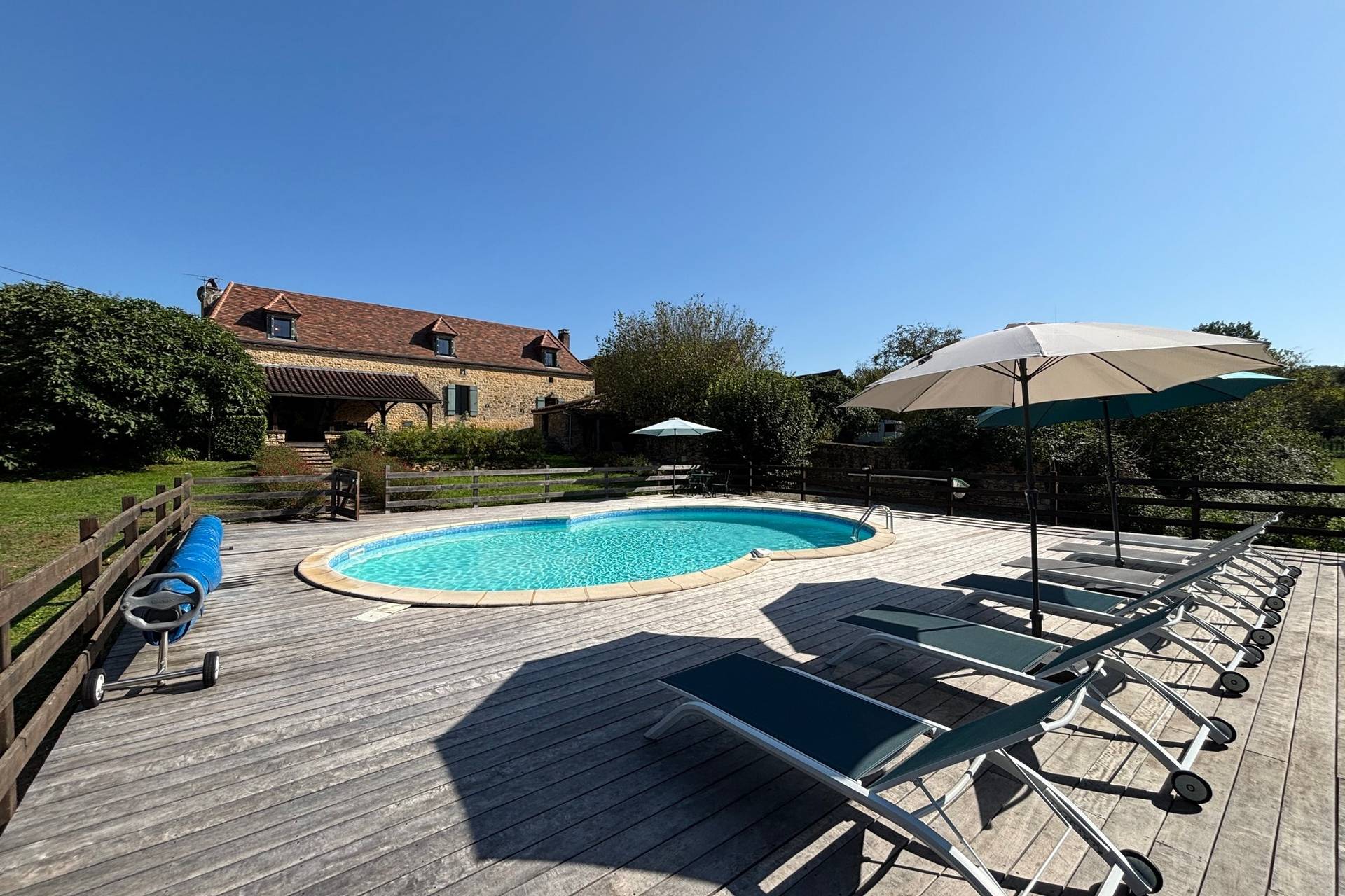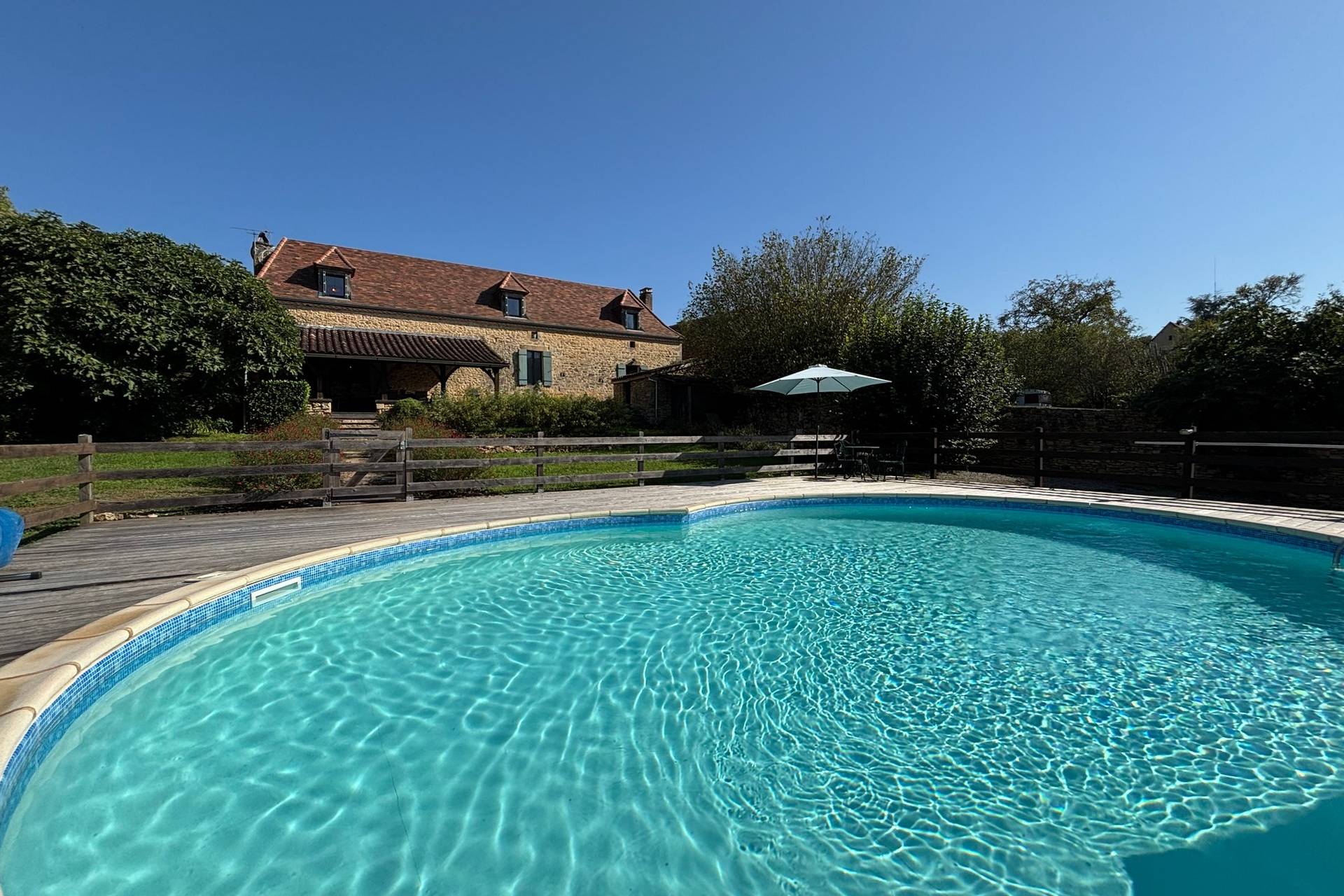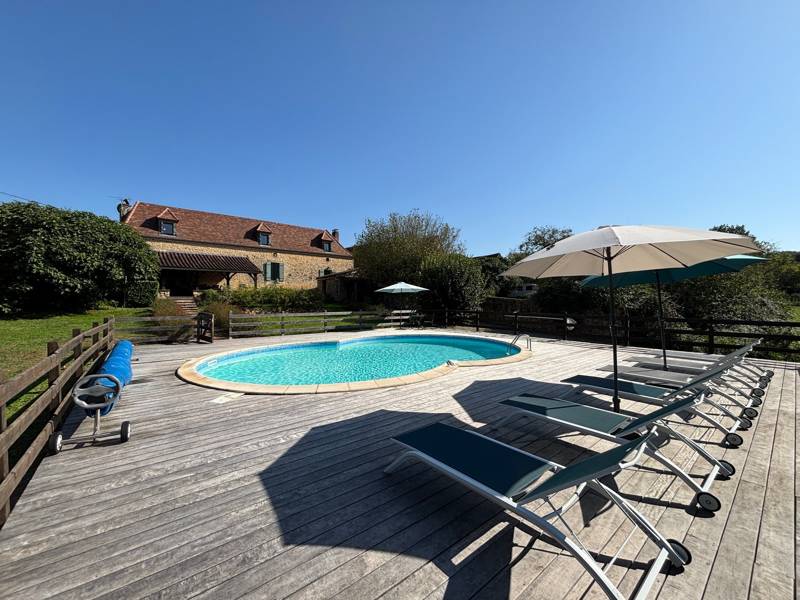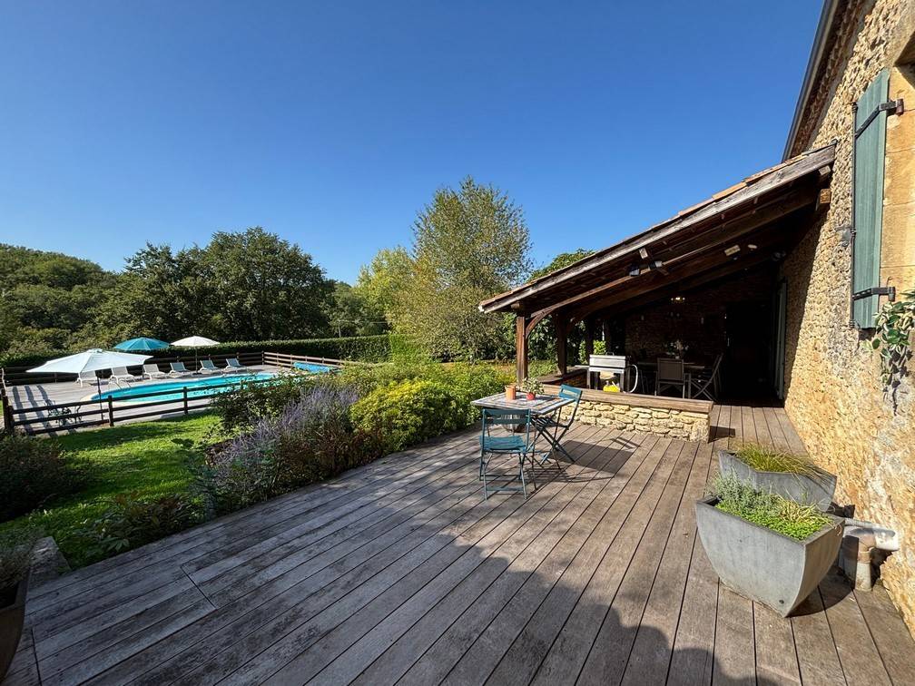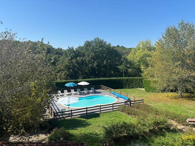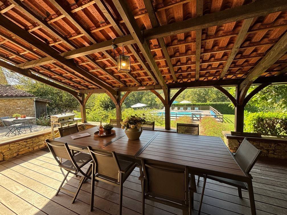 Vanuit de woonkamer geven de openslaande deuren toegang tot het overdekte terras met grote tafel. Een mooi onderhouden tuin 1000m² heeft een grasveld en bomen. De tuin is volledig omheind met een stenen muur en bosschages. Het prive zwembad is verwarmd en er zijn voldoende ligbedden waar u heerlijk kunt genieten van de Dordogne zon.