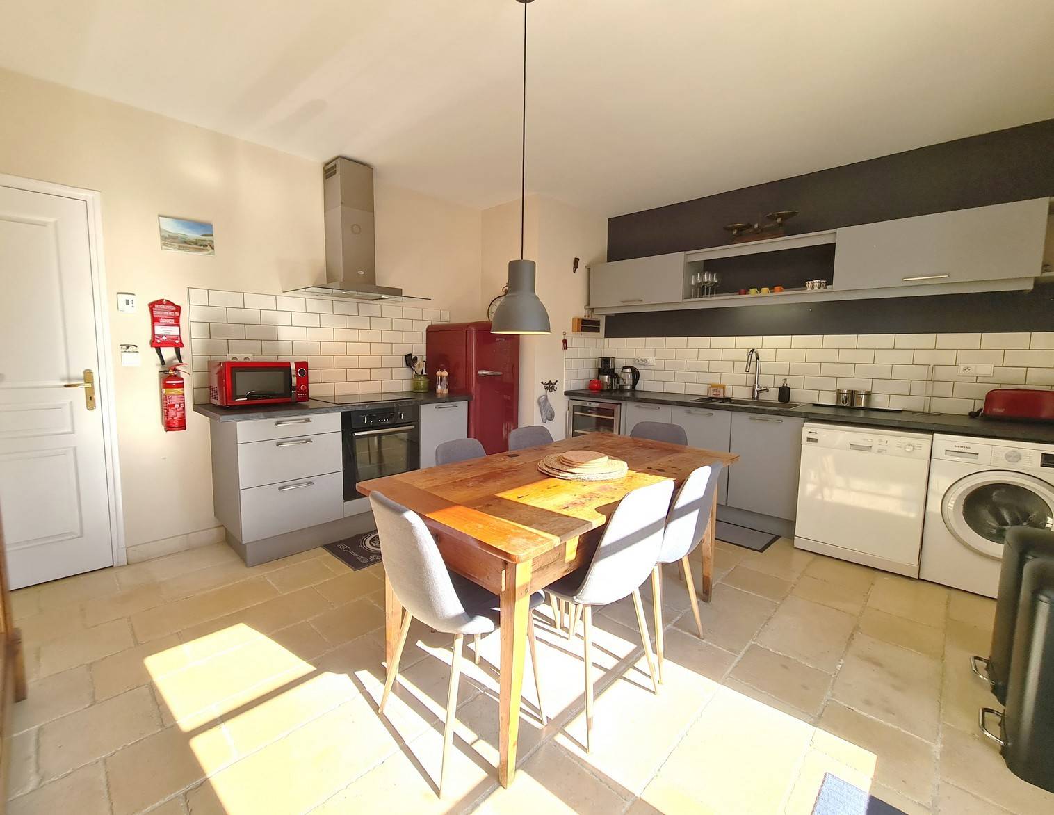 Keuken: volledig ingericht en voorzien van een oven, elektrische kookplaat, vaatwasser, koffiezetapparaat, broodrooster, waterkoker en al het nodige servies en keukengerei. Er is een kleine ontbijttafel met stoelen.