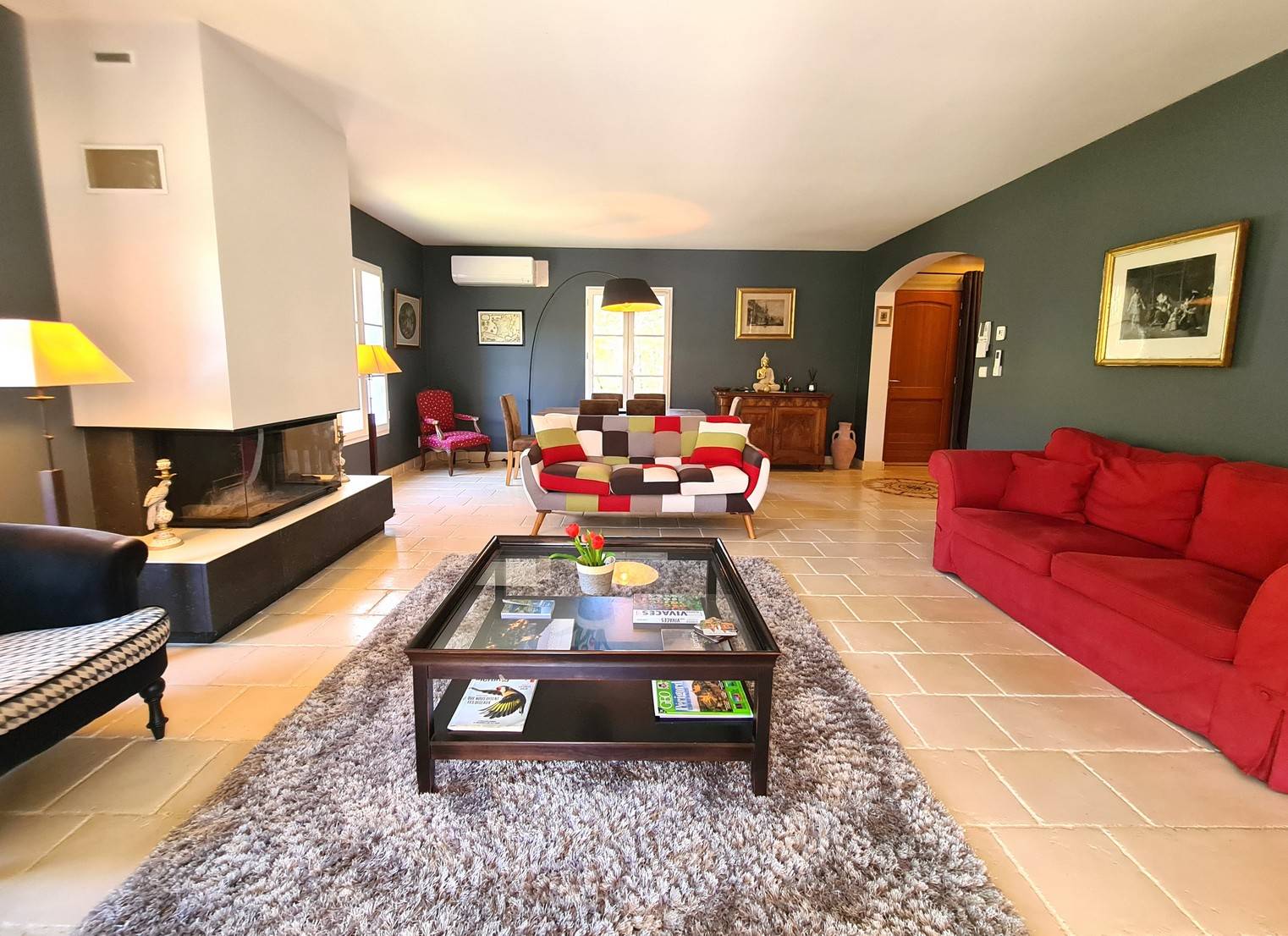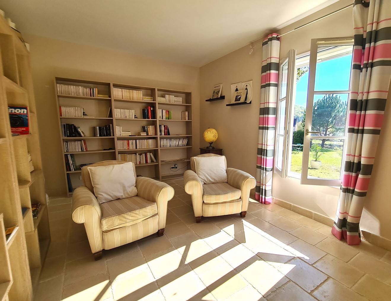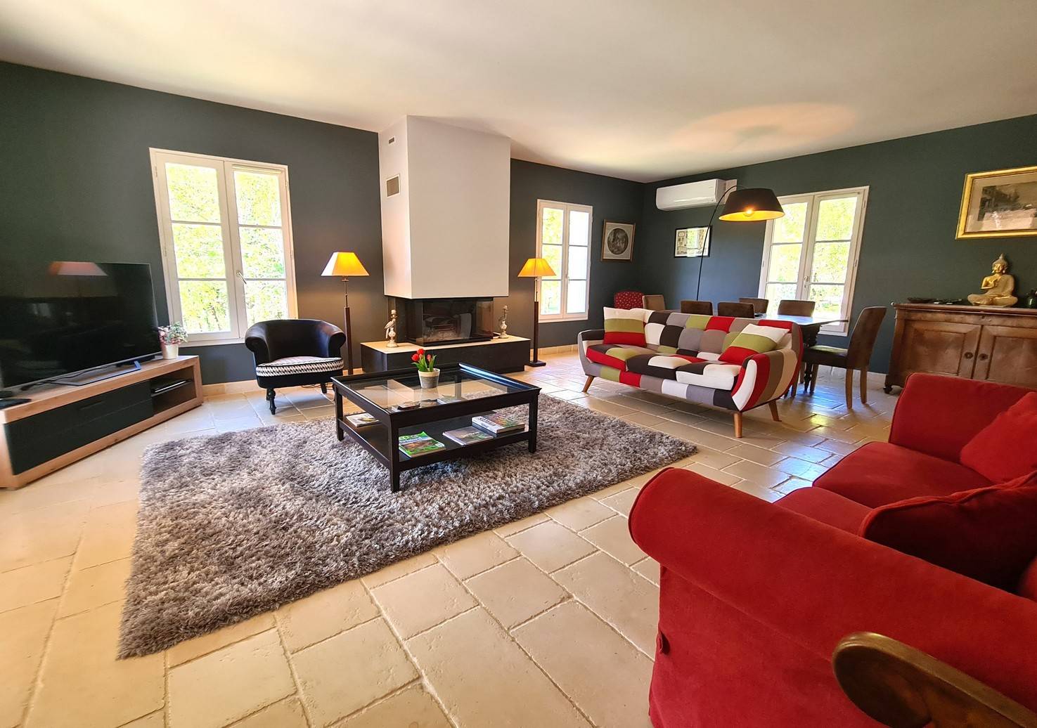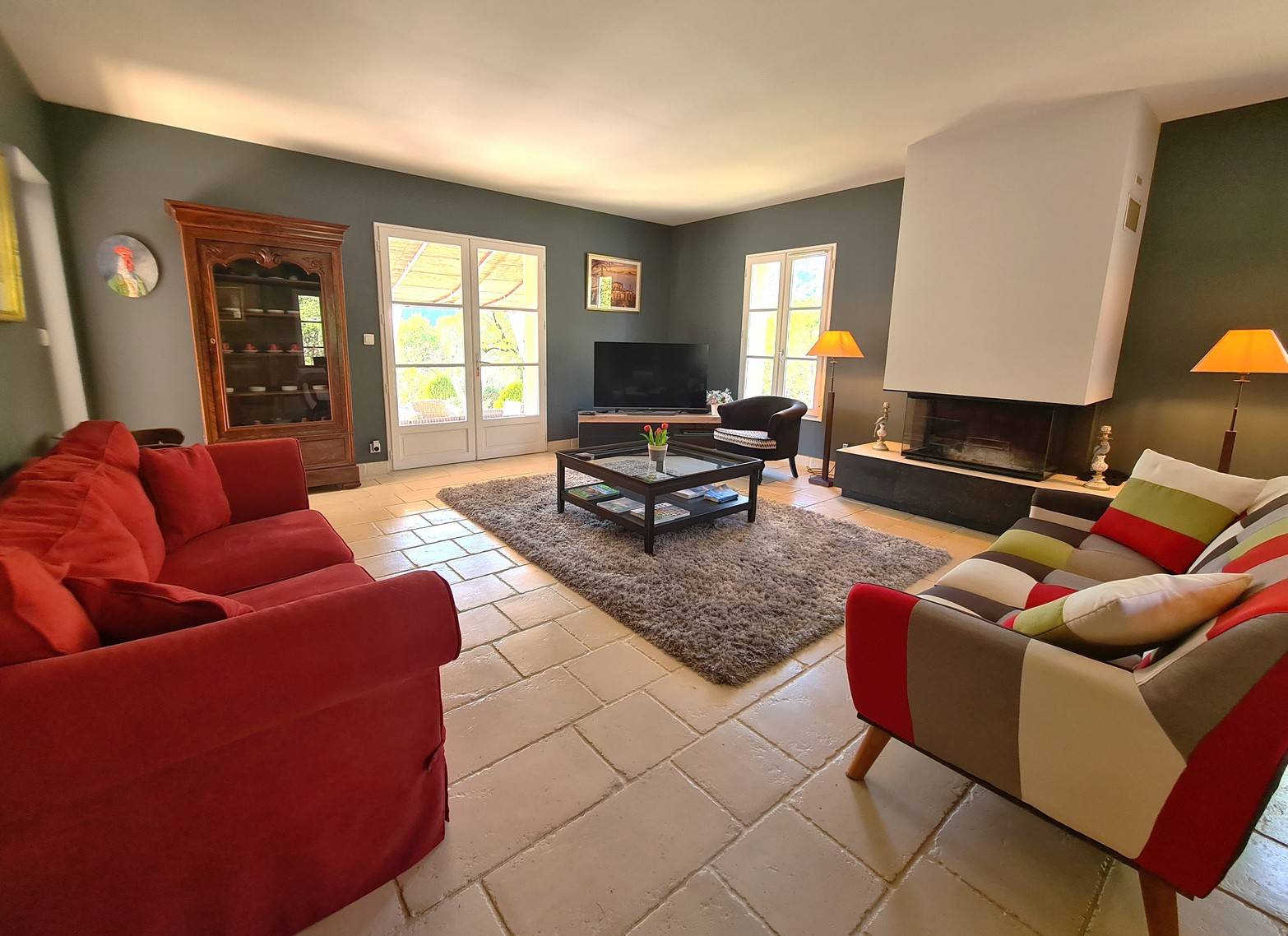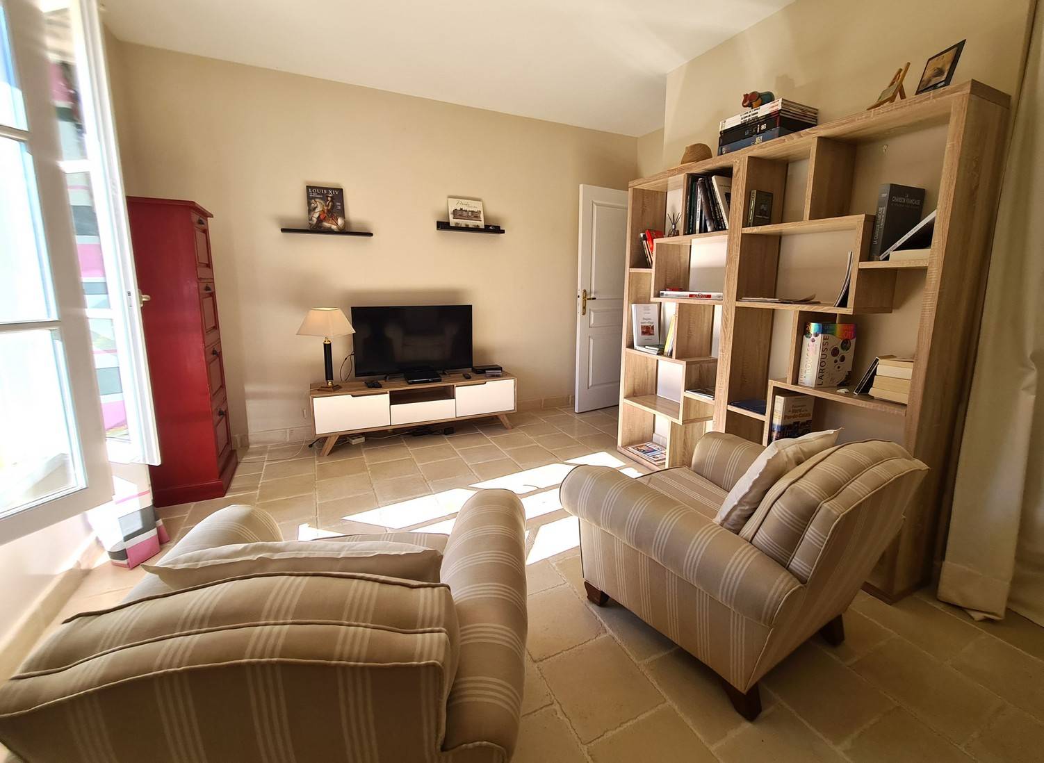Zithoek: met twee banken, een fauteuil, salontafel, lampen en smart-tv. Openslaande deuren leiden naar het terras en het zwembad.