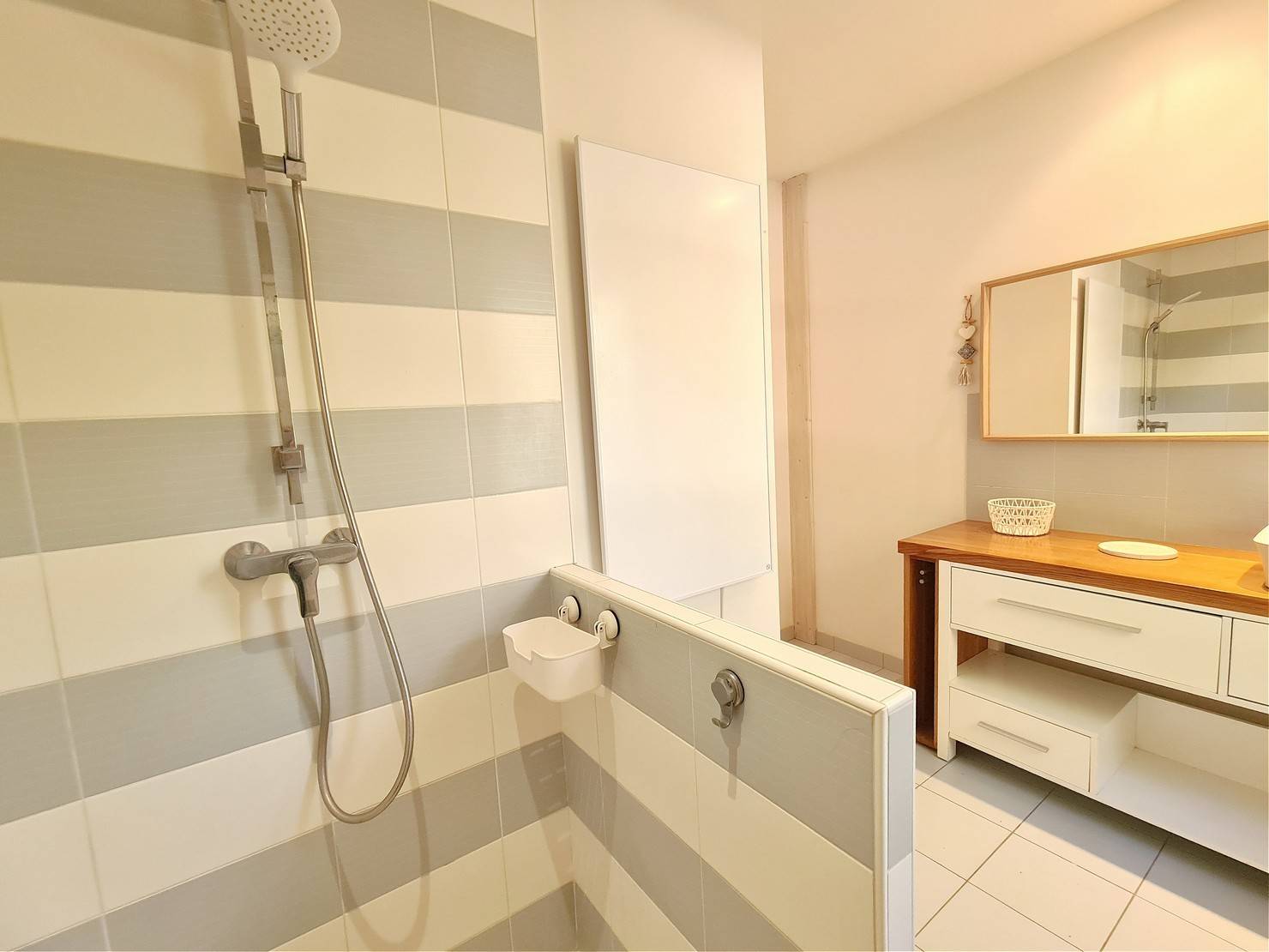 Begane grond: Slaapkamer 1 beschikt over een tweepersoonsbed (160 cm), grote kledingkast, nachtkastjes en lampen, en een privébadkamer met inloopdouche en wastafel. Het toilet is apart.