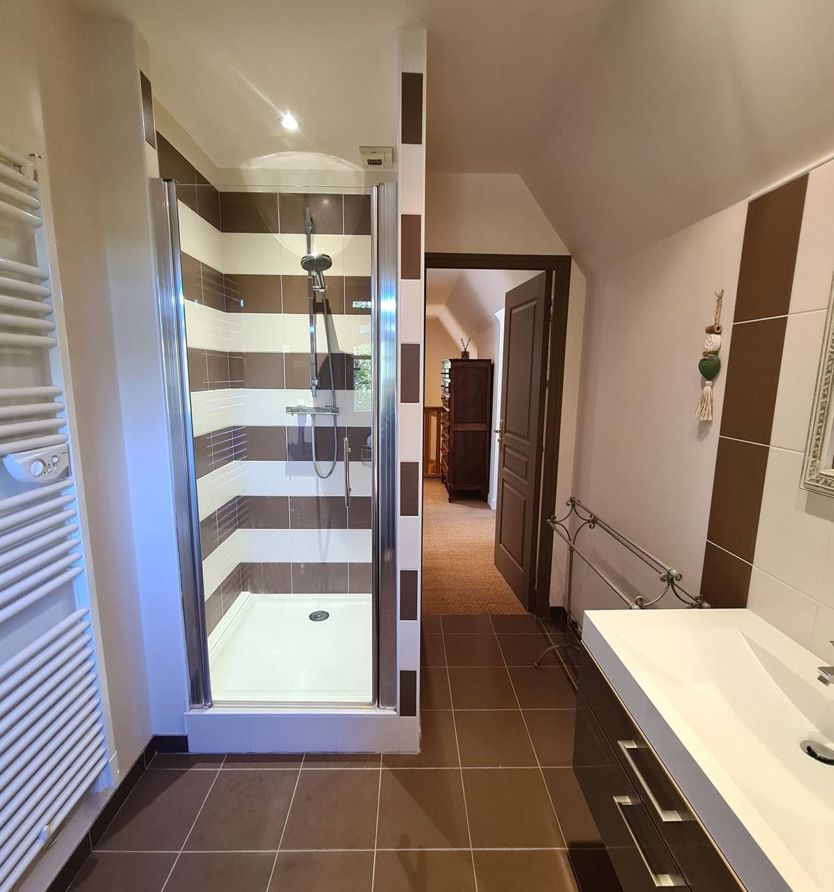 Eerste verdieping: via de trap bereik je de overige drie slaapkamers, elk met een tweepersoonsbed (160 cm), nachtkastjes, lampen en ladekast. Deze kamers delen een ruime badkamer met douche, wastafel en toilet.