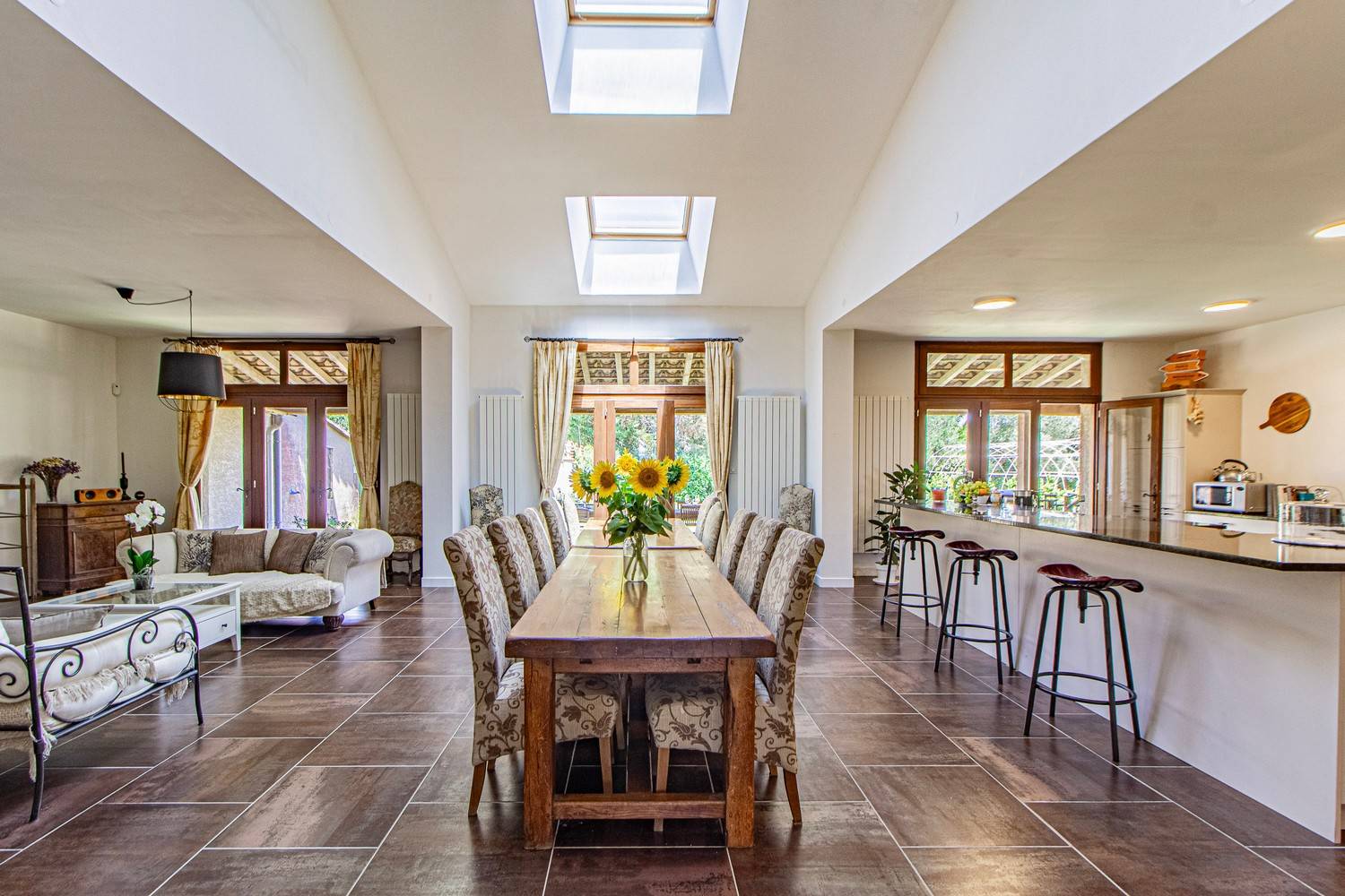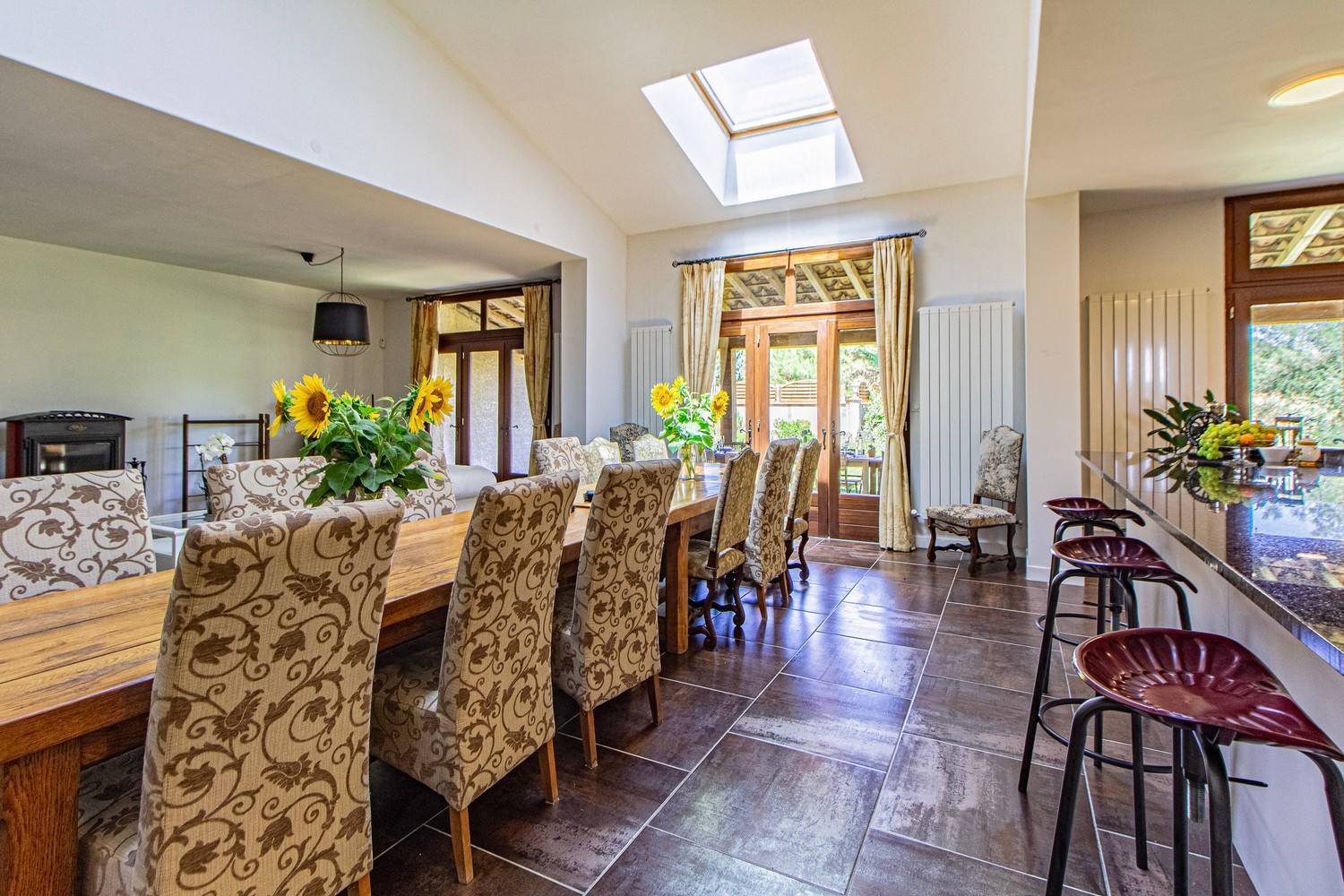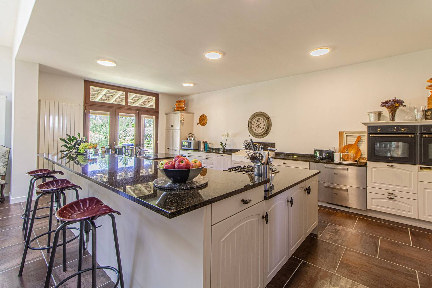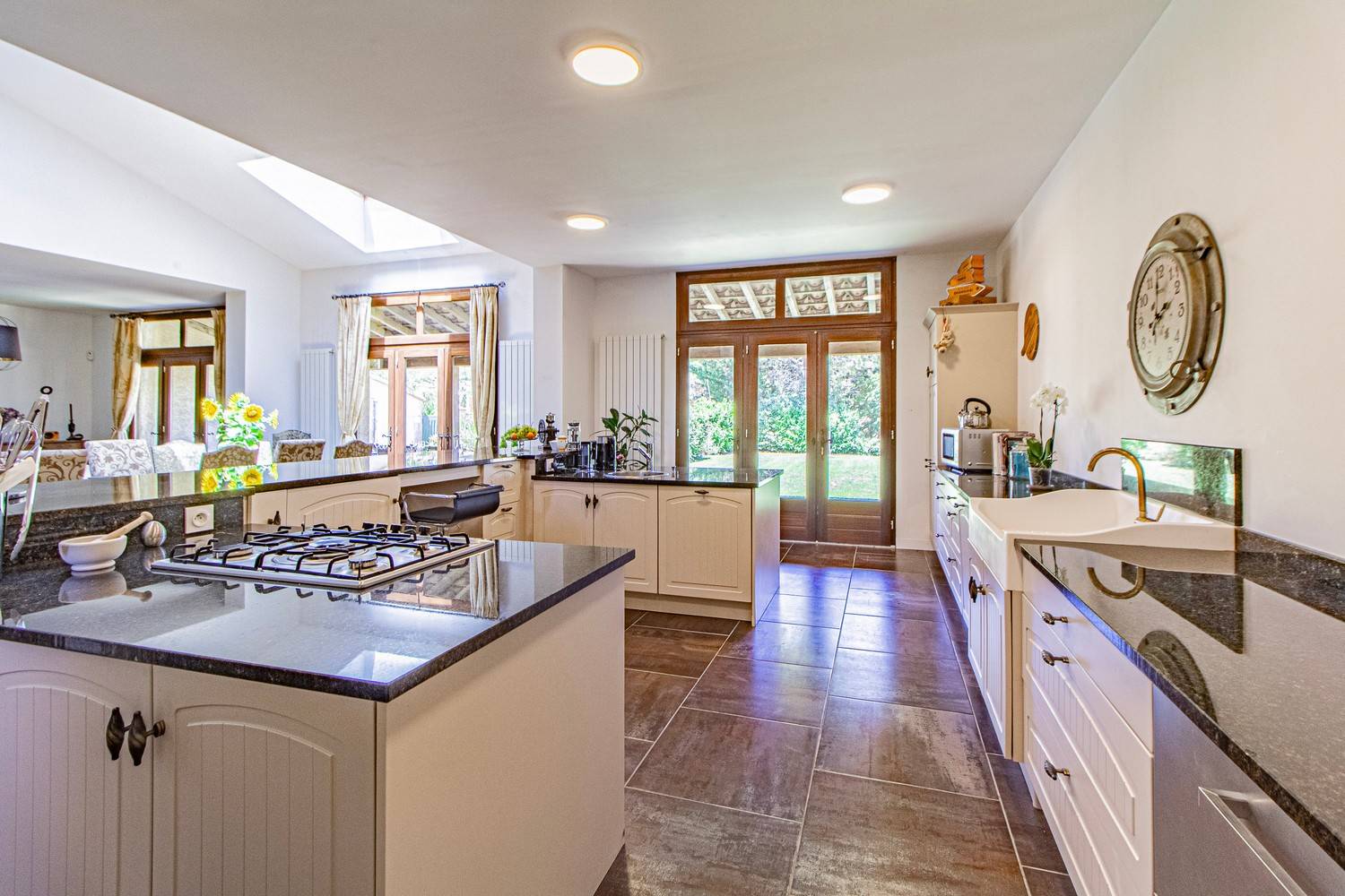 De indrukwekkende keuken en eetkamer (95 m²) vormen het hart van de villa. De 4,5 meter lange eettafel biedt plaats aan minimaal 16 personen. De professionele keuken is uitgerust met onder meer: