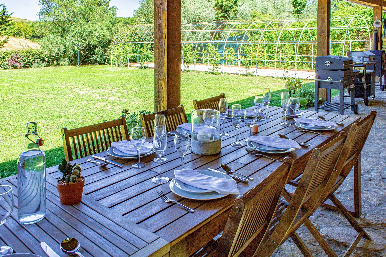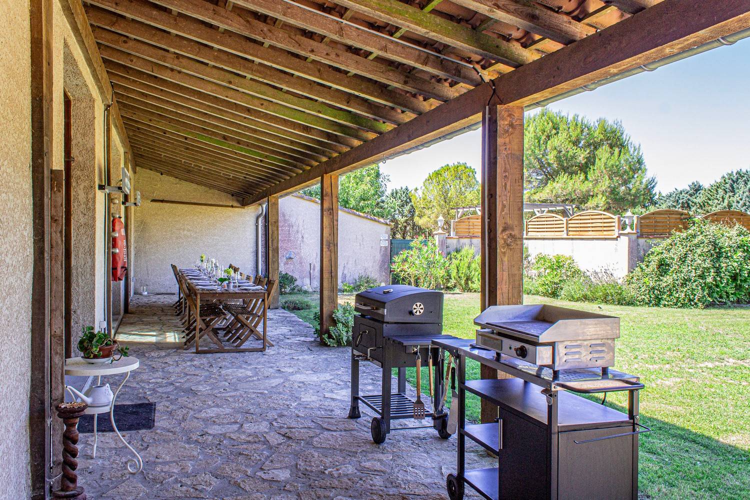 Via drie openslaande deuren bereikt u het overdekte terras van 70 m² met een 6,5 meter lange eettafel voor 20 personen. Hier geniet u van lange zomeravonden met barbecue, plancha en pizzaoven.
