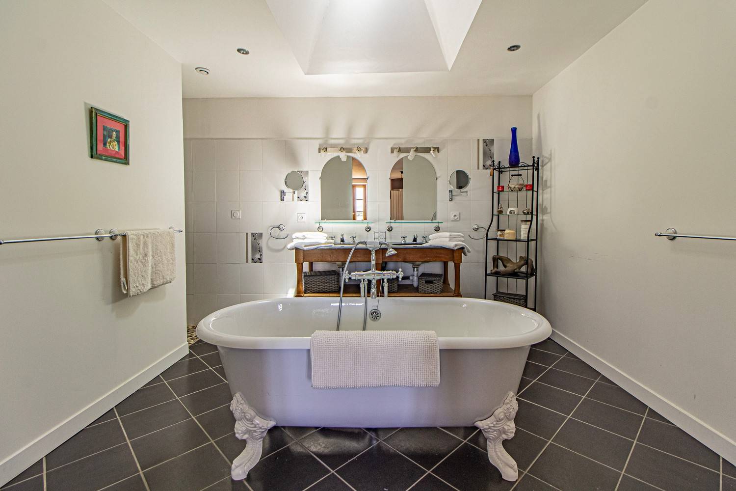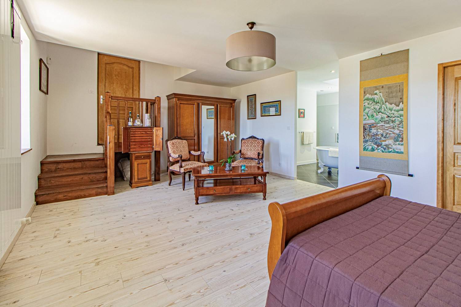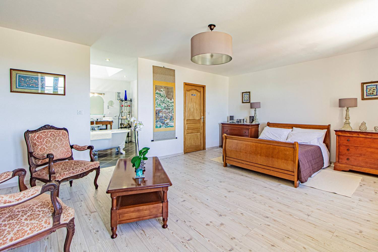 Slaapkamer 1 (50 m²): tweepersoonsbed en luxe ensuite badkamer met vrijstaand bad en inloopdouche