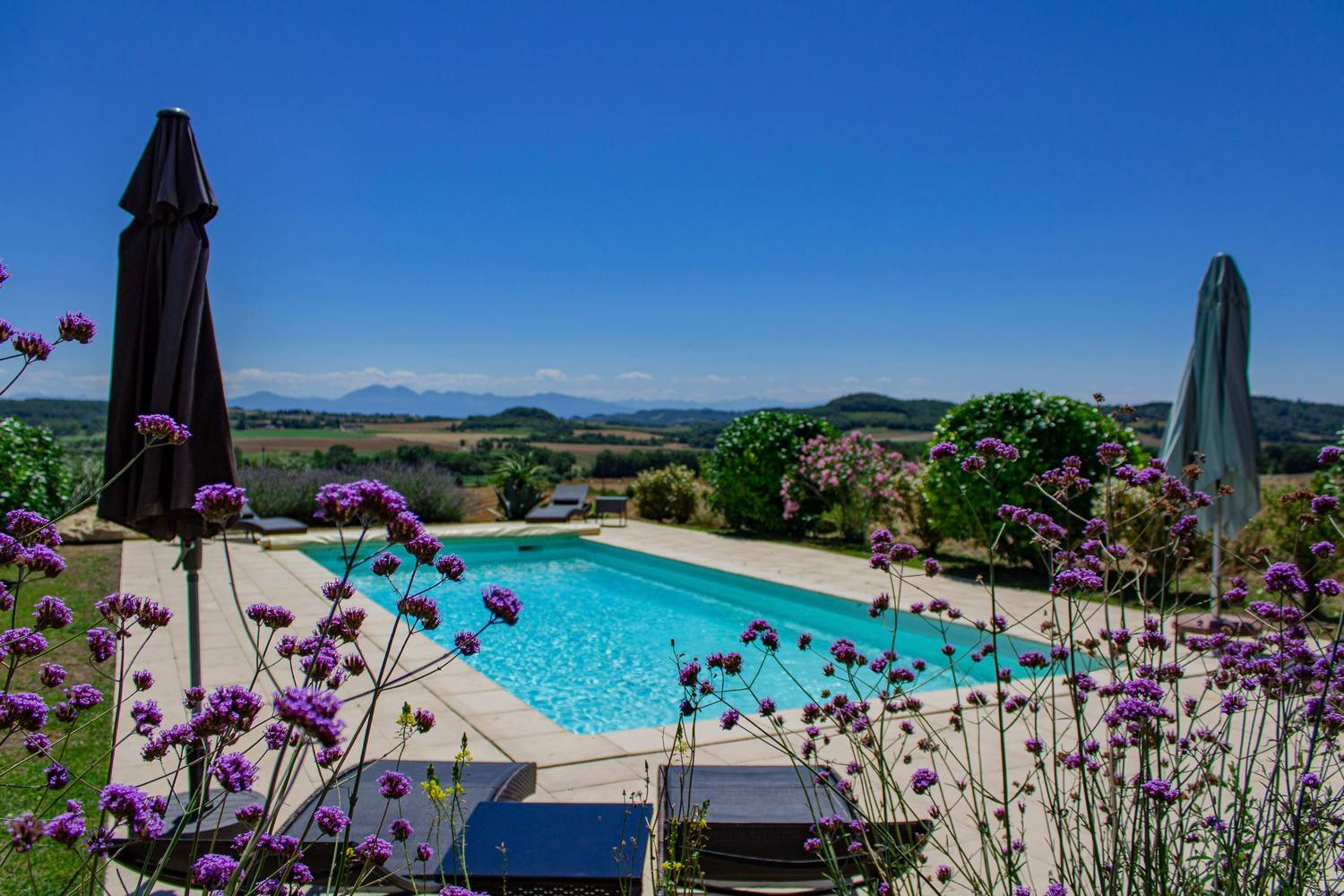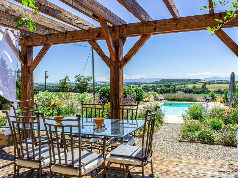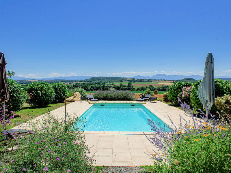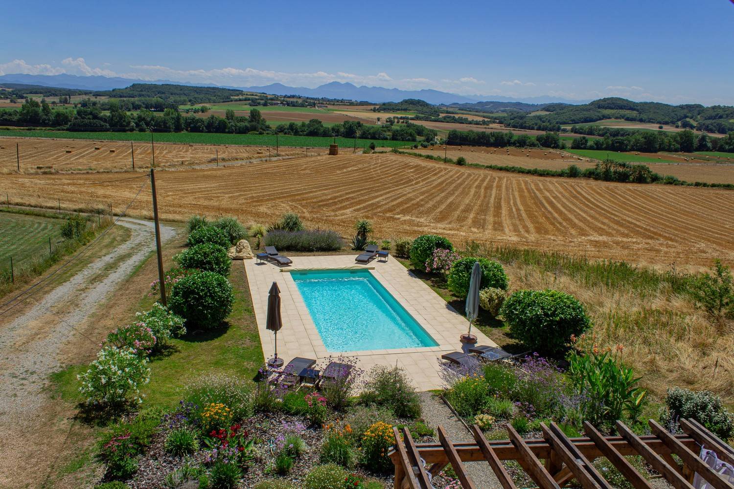 Het verwarmde privézwembad van 10 x 4 meter ligt op het zuiden en biedt een spectaculair panoramisch uitzicht op de Pyreneeën. Het zonneterras is voorzien van comfortabele ligstoelen en wordt omgeven door groen en bloeiende planten.
