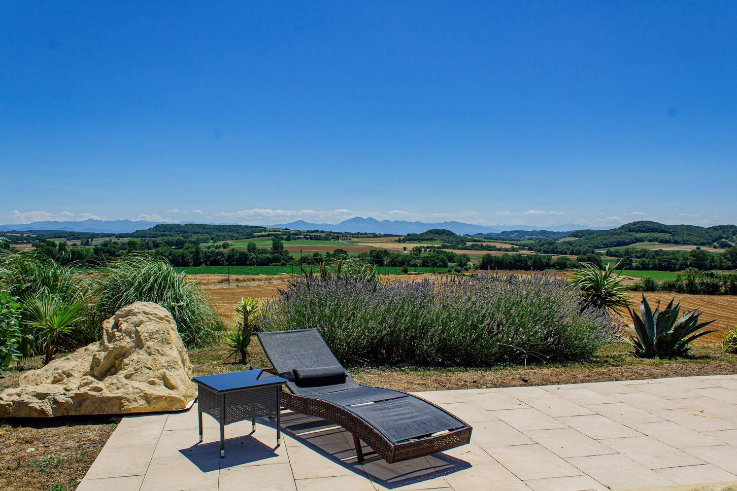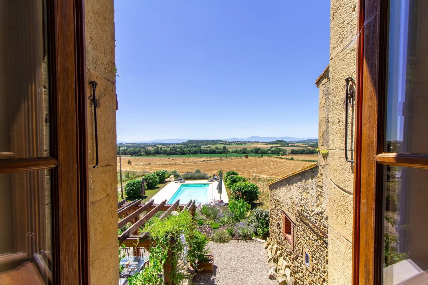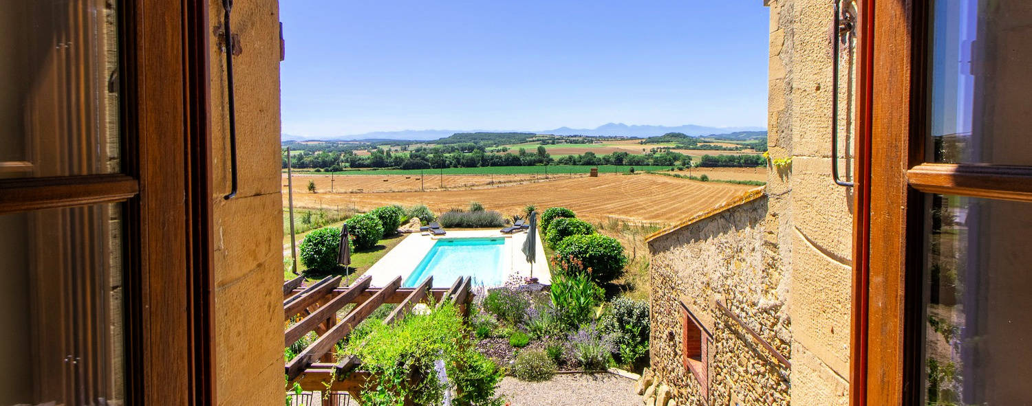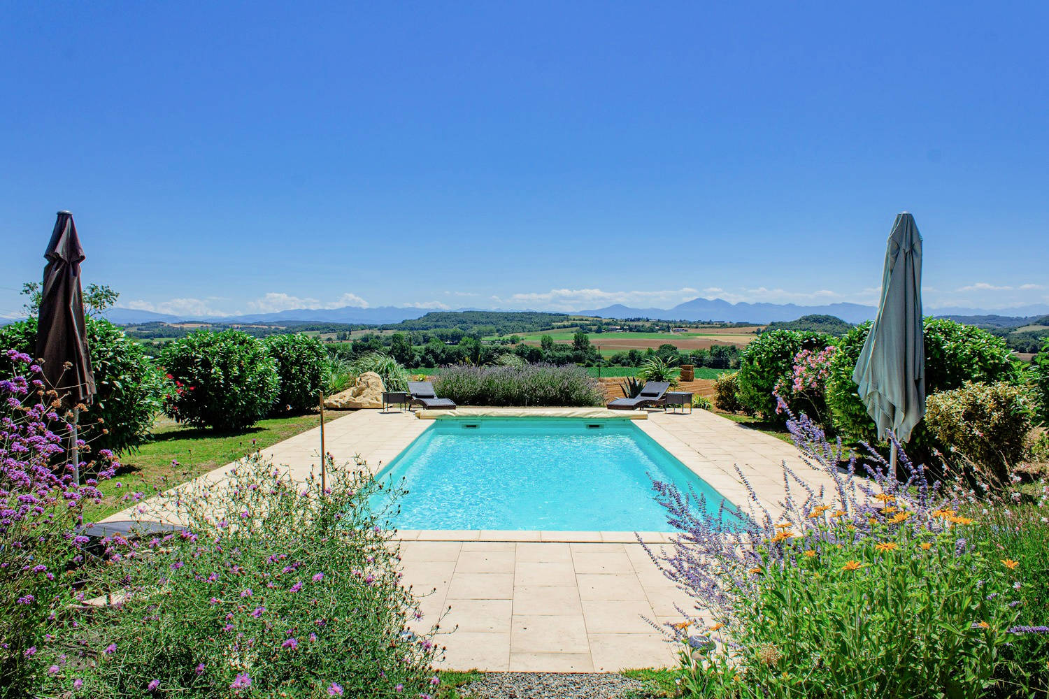 Het verwarmde privézwembad van 10 x 4 meter ligt op het zuiden en biedt een spectaculair panoramisch uitzicht op de Pyreneeën. Het zonneterras is voorzien van comfortabele ligstoelen en wordt omgeven door groen en bloeiende planten.