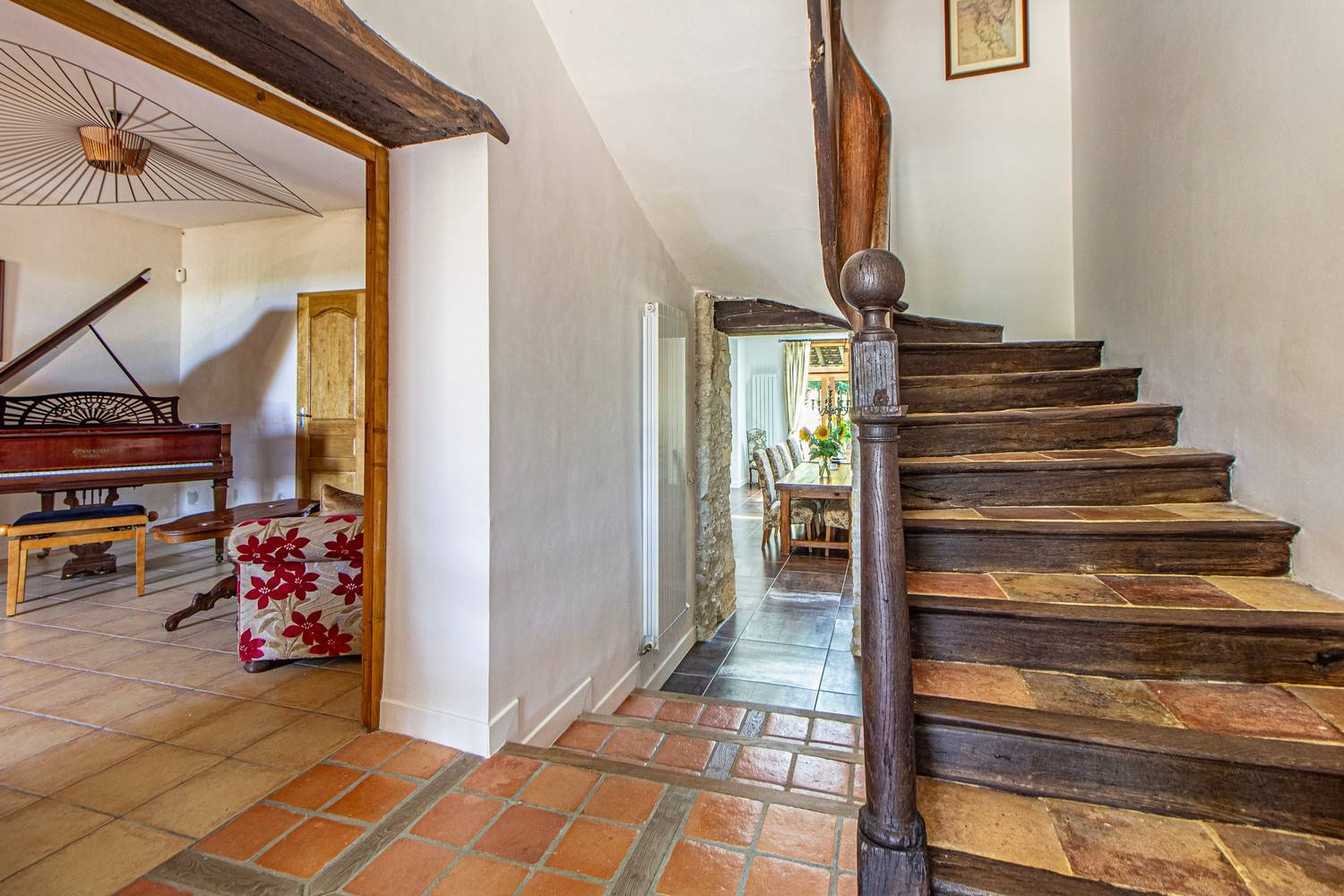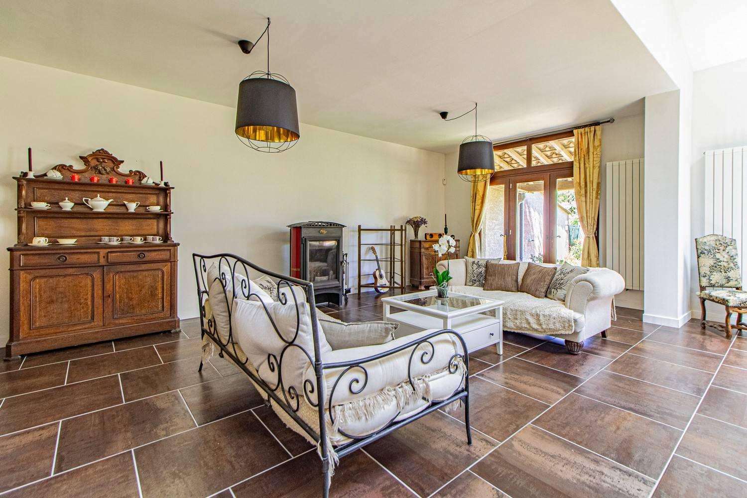 Op de begane grond bevindt zich een sfeervolle zitkamer in traditionele stijl met open haard en vleugel. Aansluitend vindt u een royale open leefruimte met extra zitgedeelte, een grote eettafel en een volledig uitgeruste keuken met Godin houtkachel.