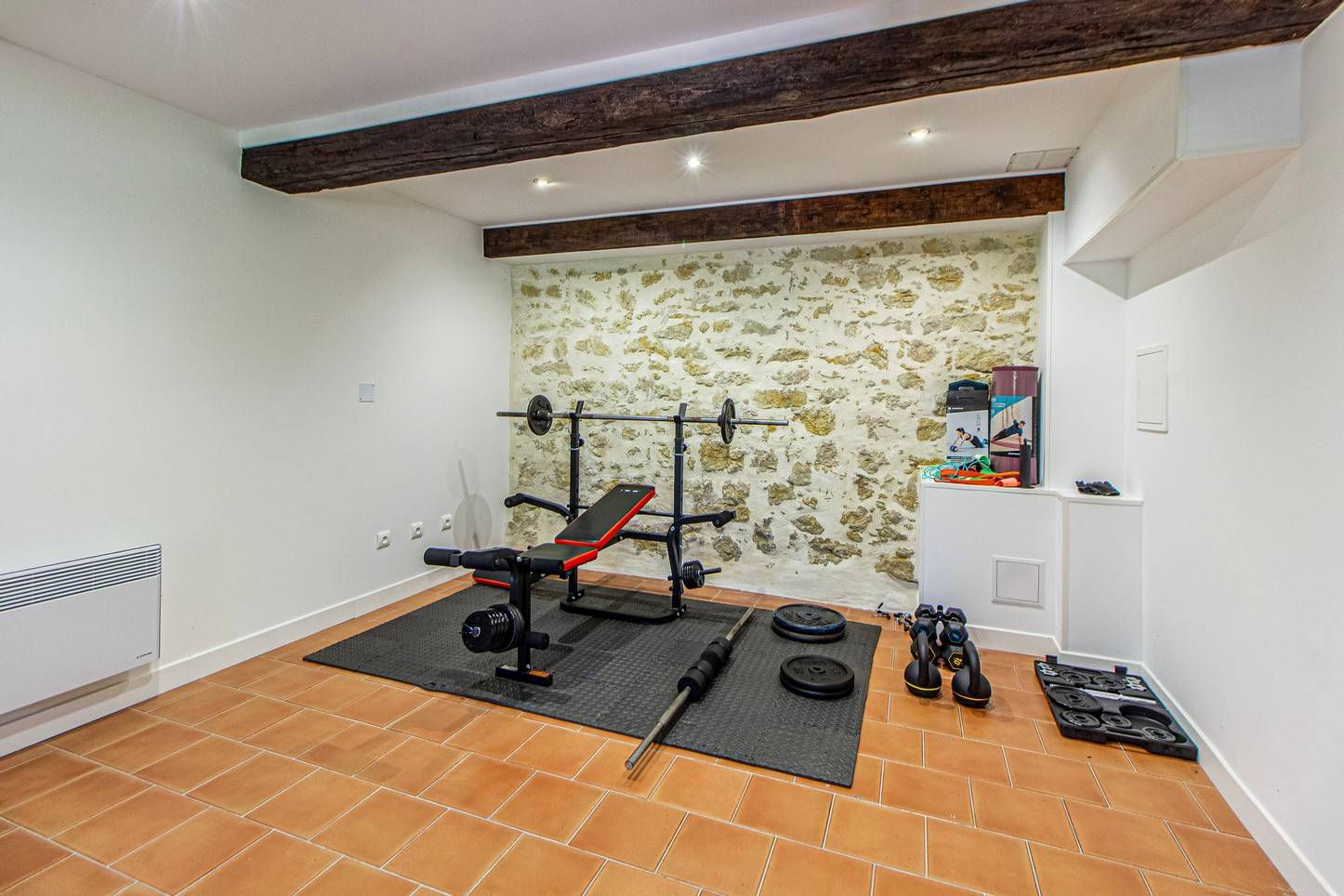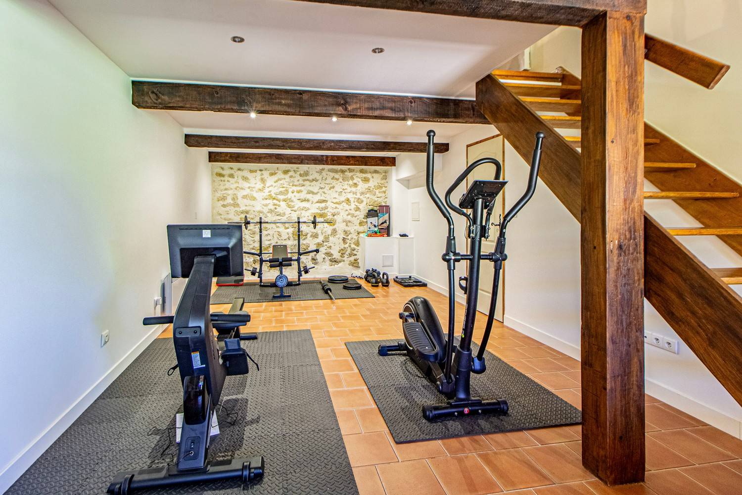 Privé fitnessruimte met crosstrainer, roeimachine en gewichten