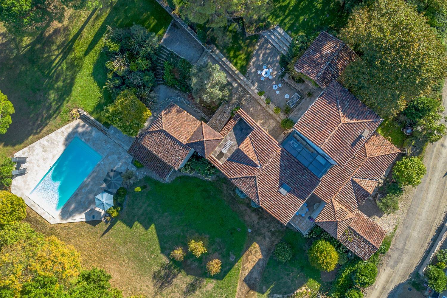 De villa ligt op een terrein van maar liefst 30.000 m² met gazons, bosgedeelte en volledige privacy.