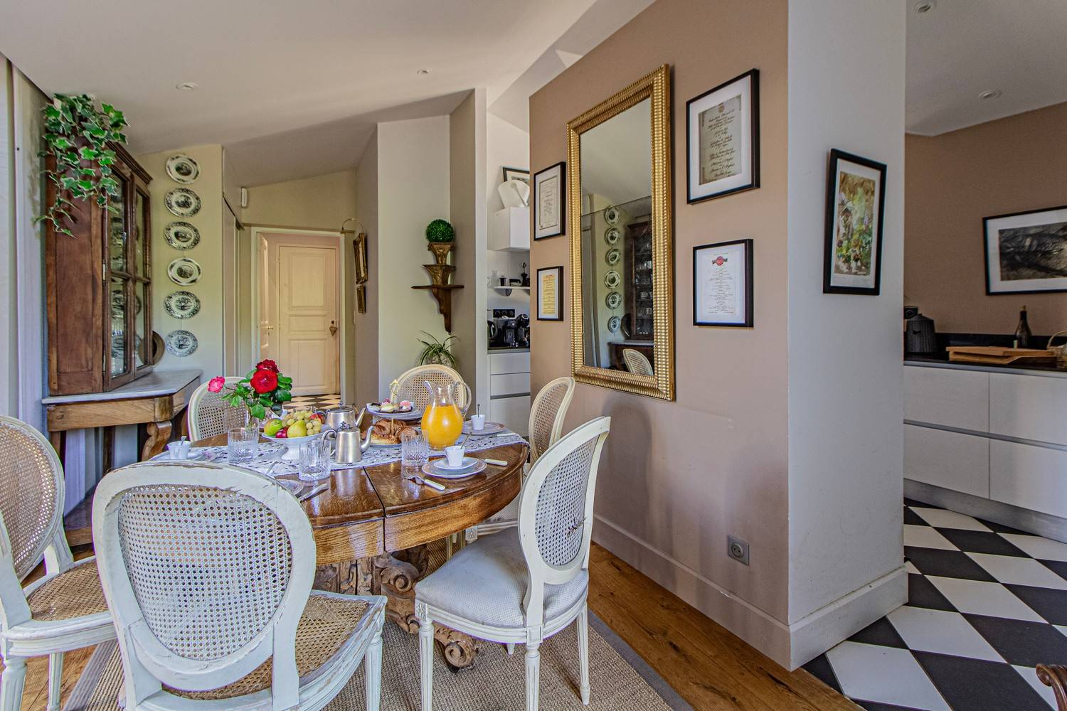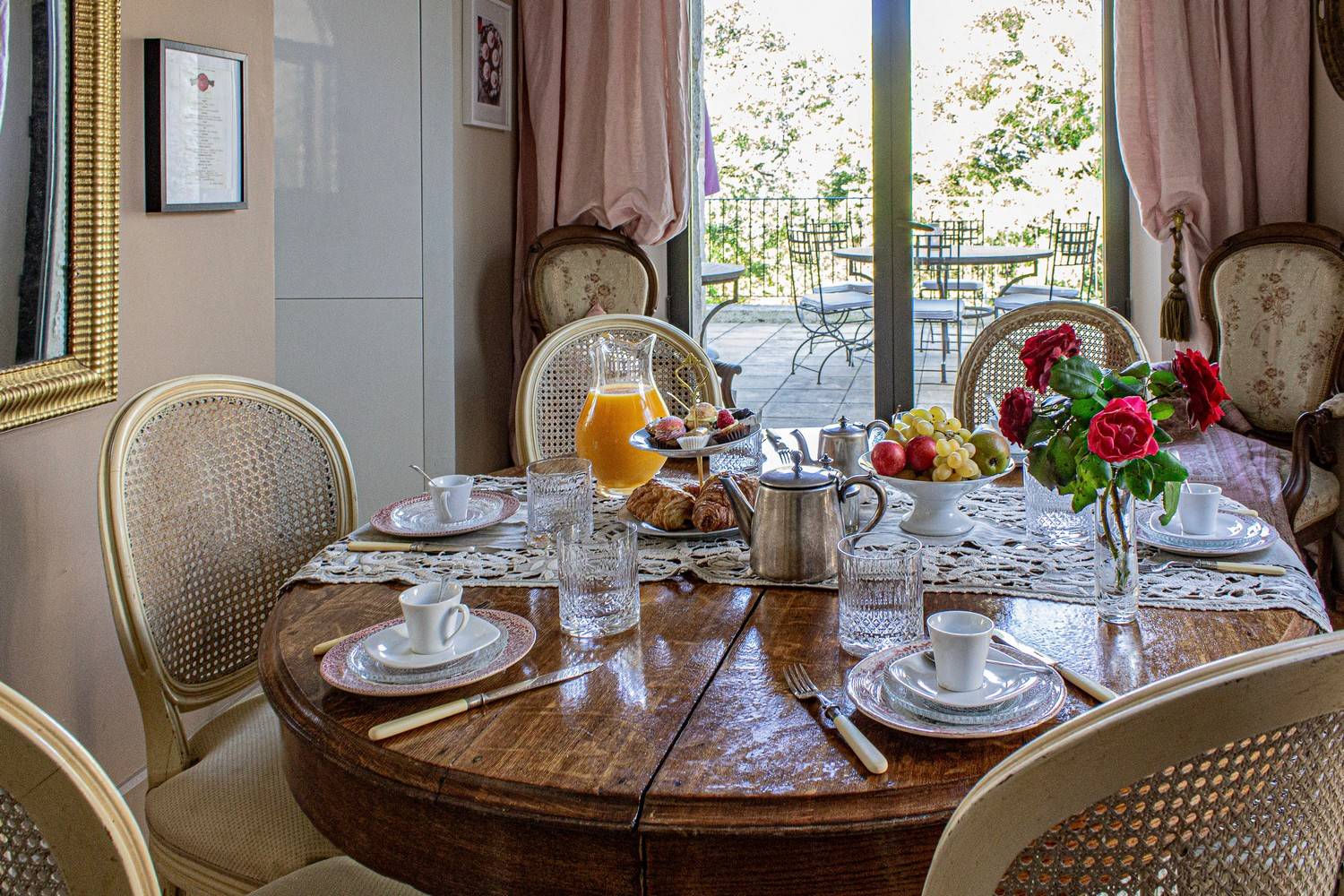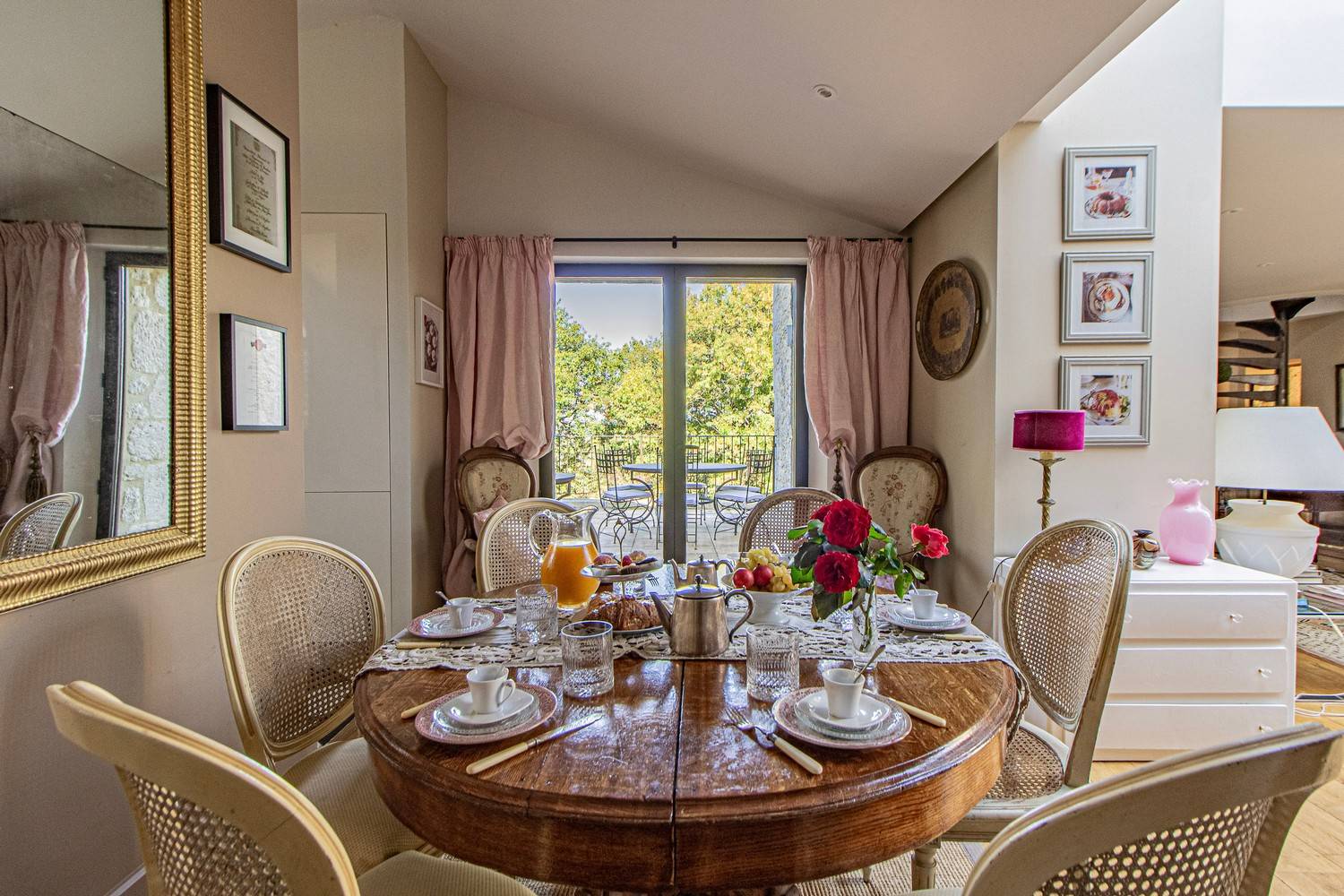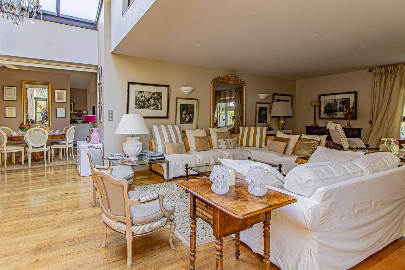 De ruime woonkamer is stijlvol ingericht met antieke meubels, kroonluchters en hardhouten vloeren. Grote glazen deuren zorgen voor veel licht en geven direct toegang tot het terras en de tuin. Aangrenzend bevindt zich de eetkamer met een eettafel voor 6 personen en een tweede eethoek op het balkon met uitzicht op zwembad en tuin.