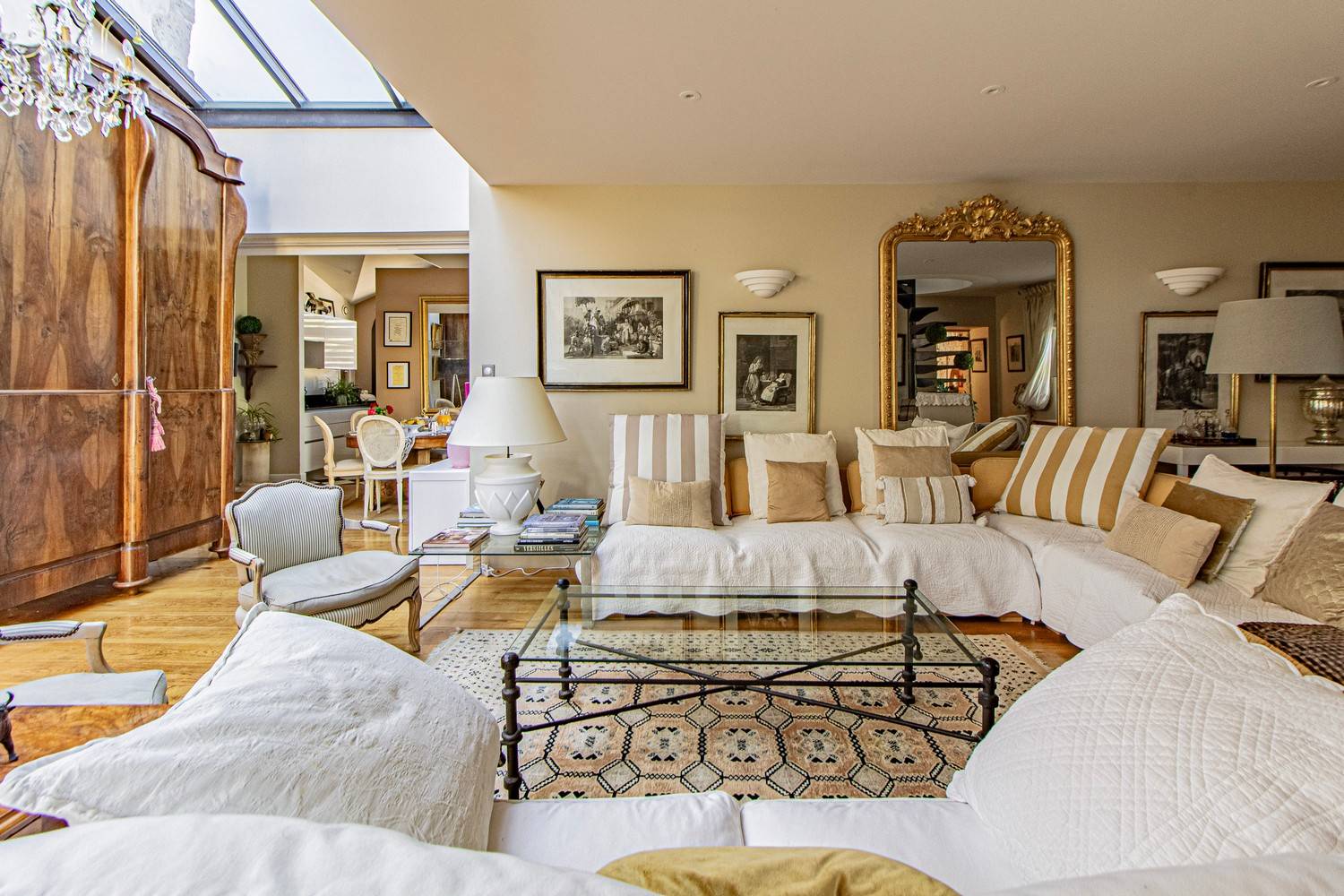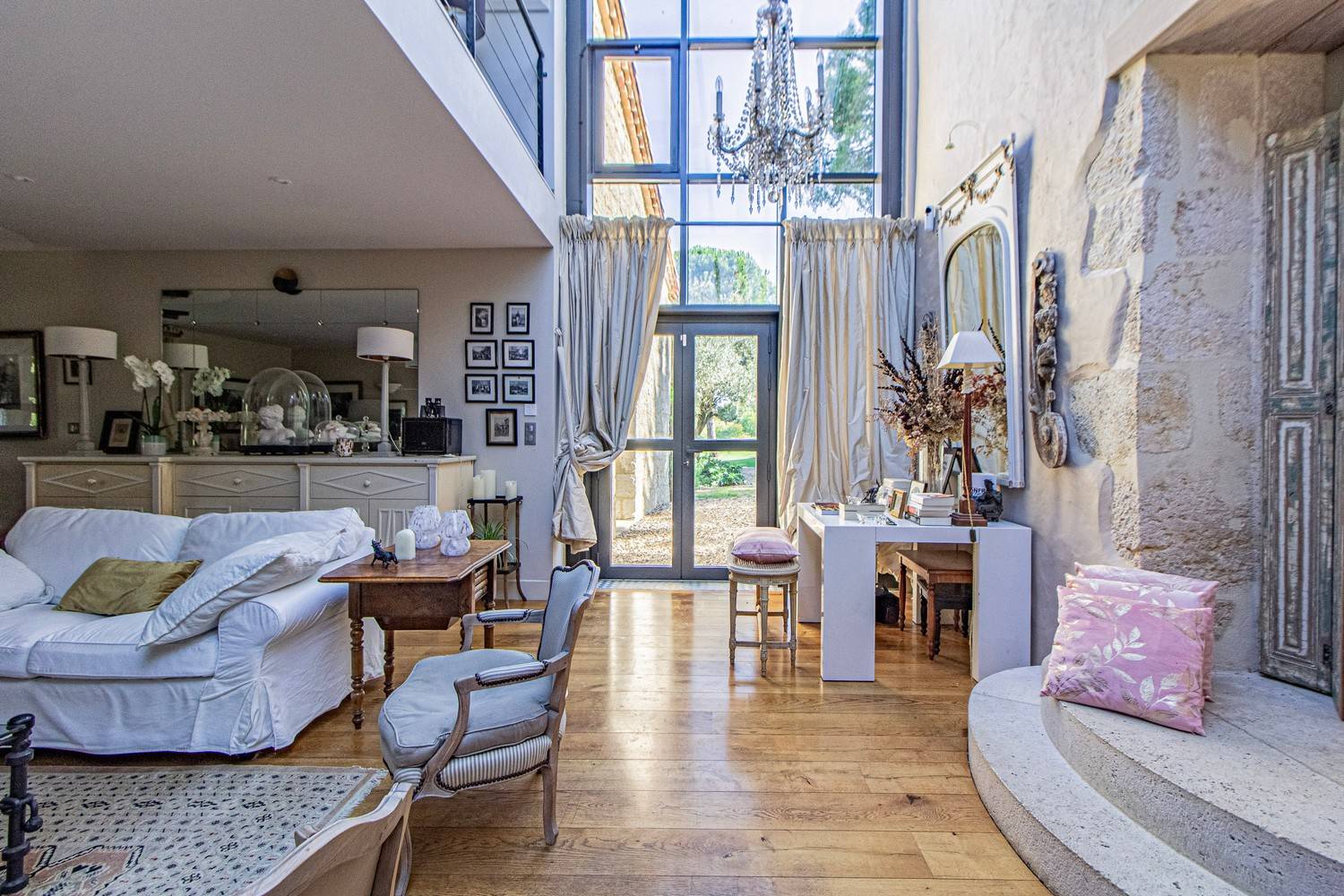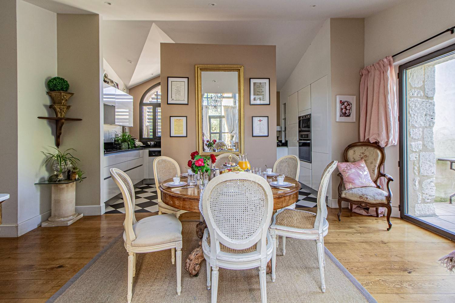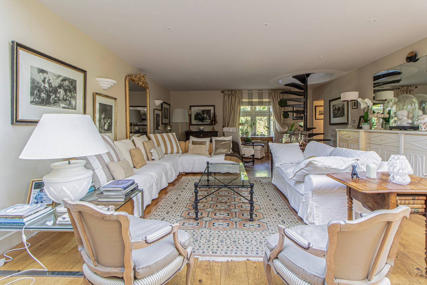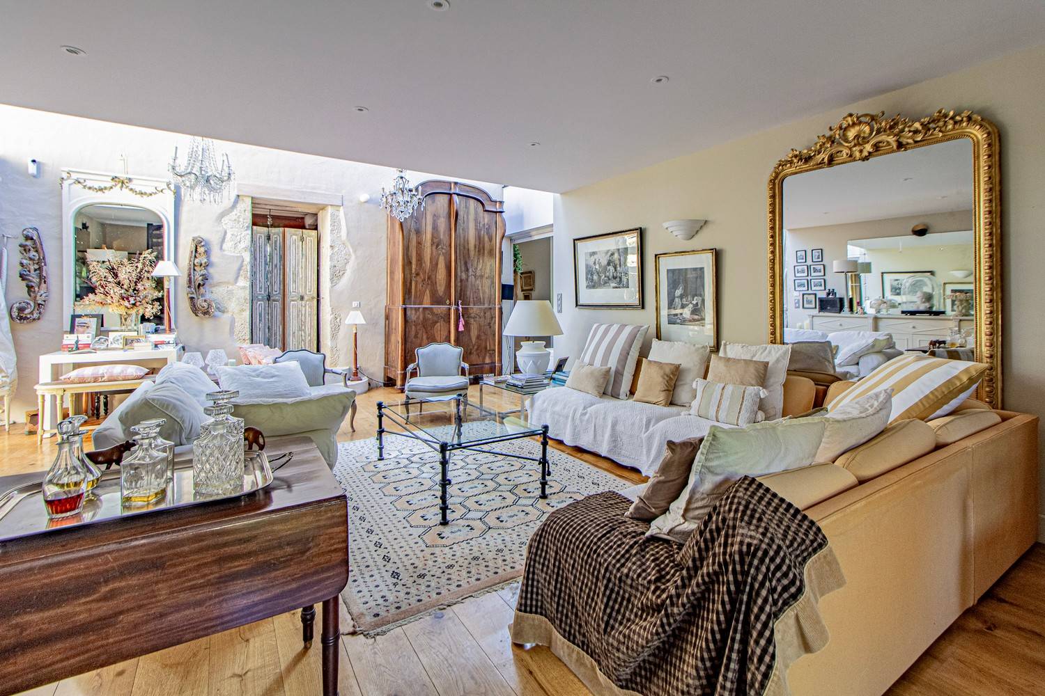 De ruime woonkamer is stijlvol ingericht met antieke meubels, kroonluchters en hardhouten vloeren. Grote glazen deuren zorgen voor veel licht en geven direct toegang tot het terras en de tuin. Aangrenzend bevindt zich de eetkamer met een eettafel voor 6 personen en een tweede eethoek op het balkon met uitzicht op zwembad en tuin.