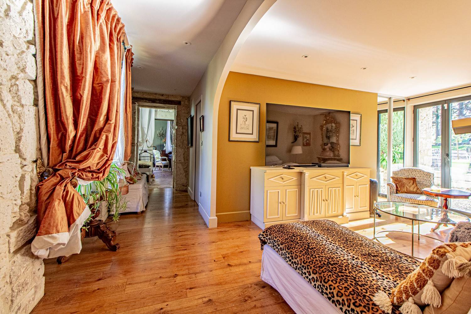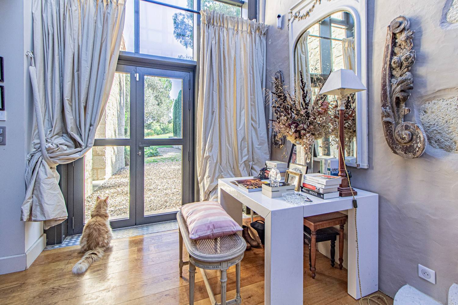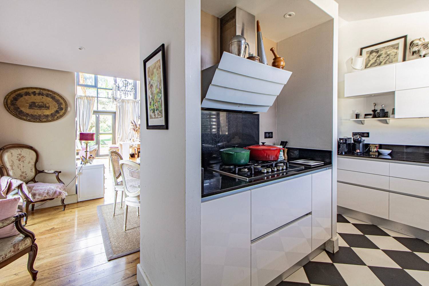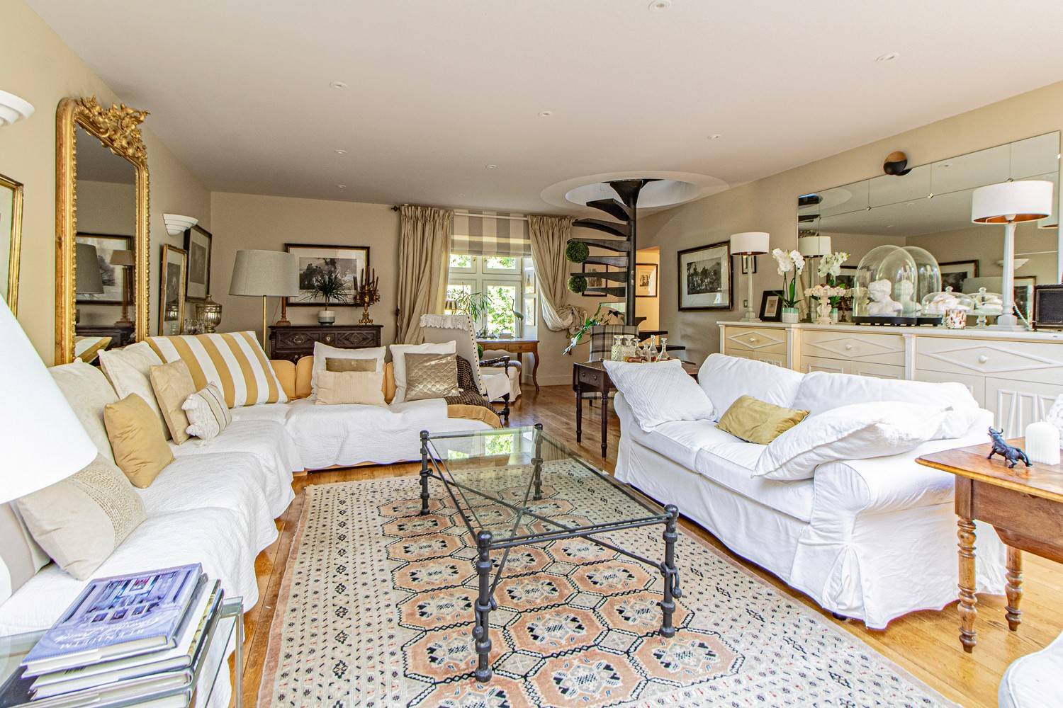 De ruime woonkamer is stijlvol ingericht met antieke meubels, kroonluchters en hardhouten vloeren. Grote glazen deuren zorgen voor veel licht en geven direct toegang tot het terras en de tuin. Aangrenzend bevindt zich de eetkamer met een eettafel voor 6 personen en een tweede eethoek op het balkon met uitzicht op zwembad en tuin.