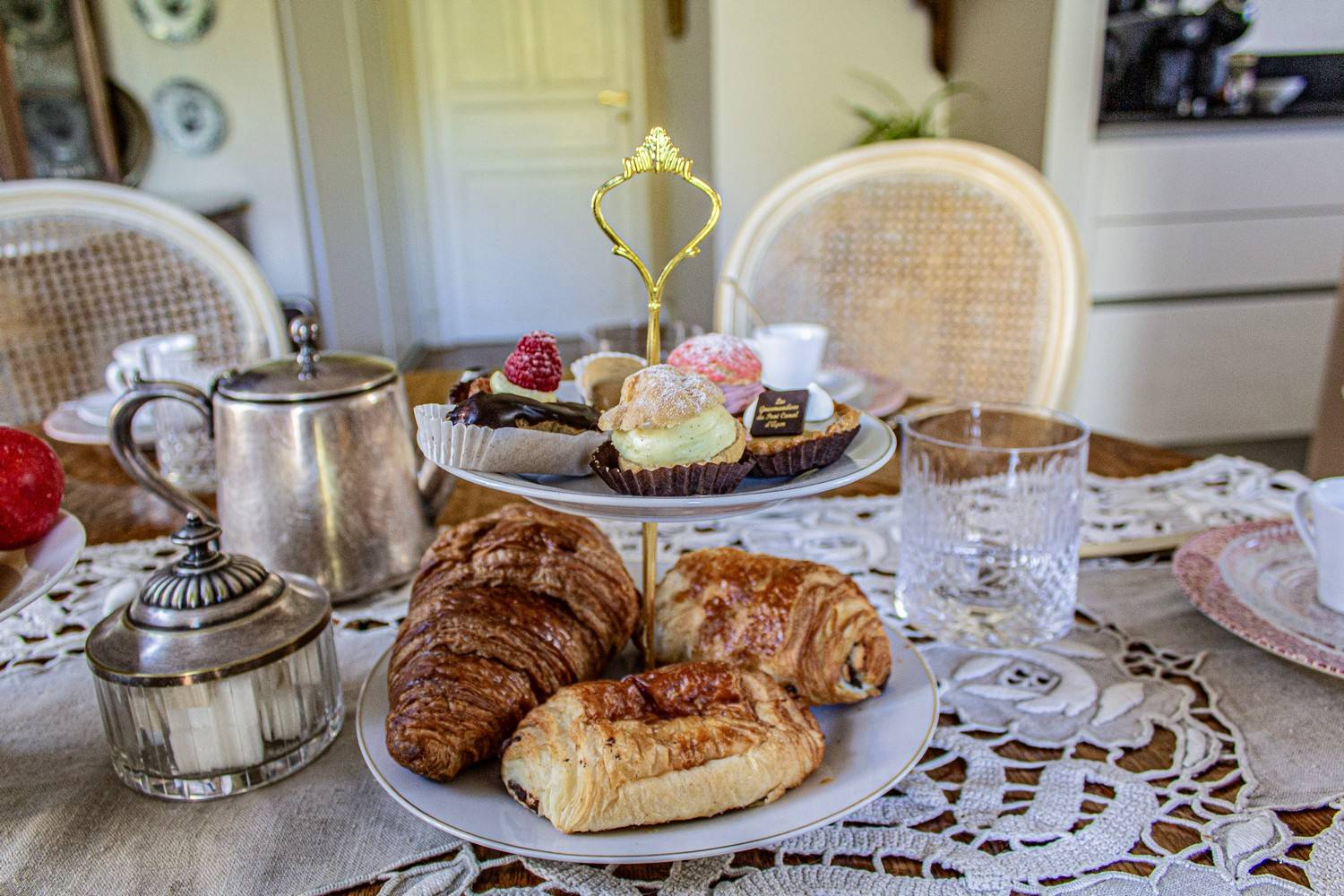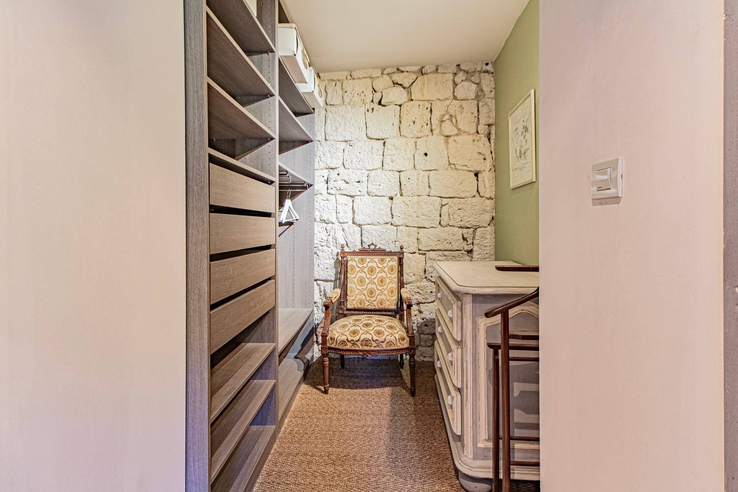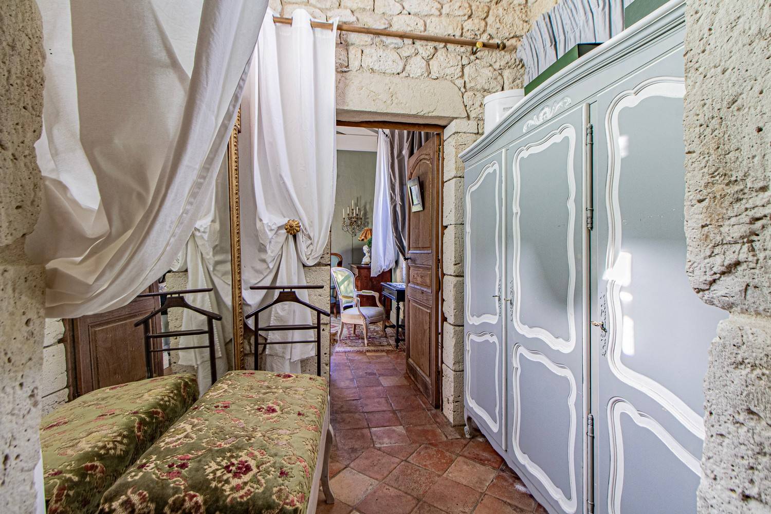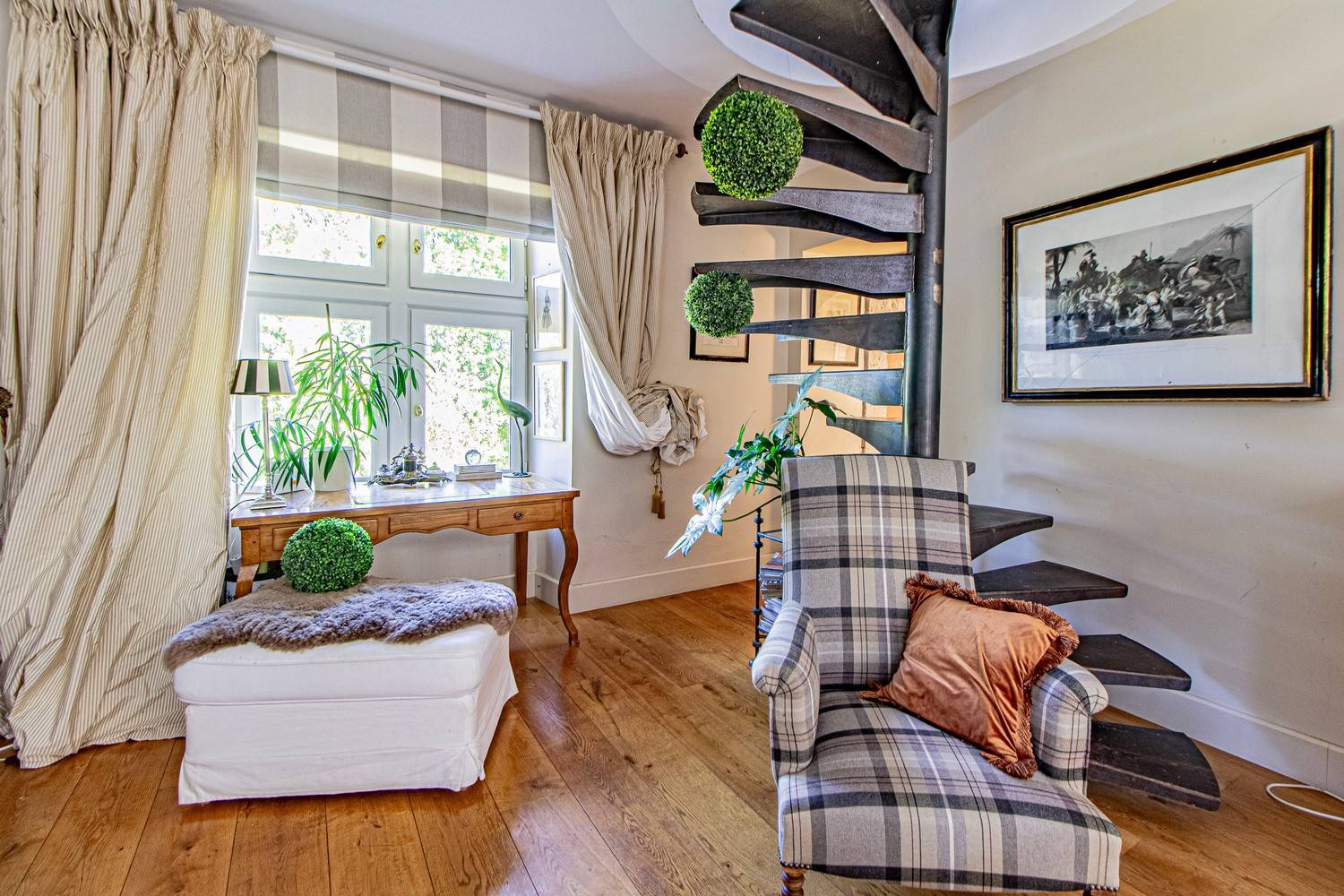 De ruime woonkamer is stijlvol ingericht met antieke meubels, kroonluchters en hardhouten vloeren. Grote glazen deuren zorgen voor veel licht en geven direct toegang tot het terras en de tuin. Aangrenzend bevindt zich de eetkamer met een eettafel voor 6 personen en een tweede eethoek op het balkon met uitzicht op zwembad en tuin.