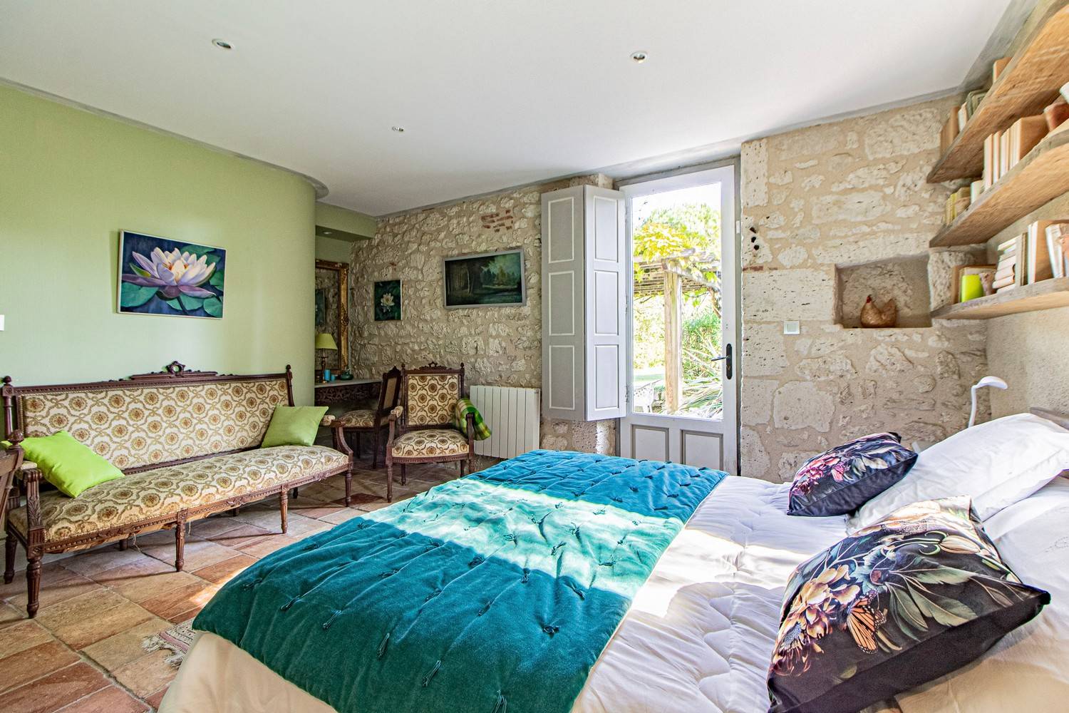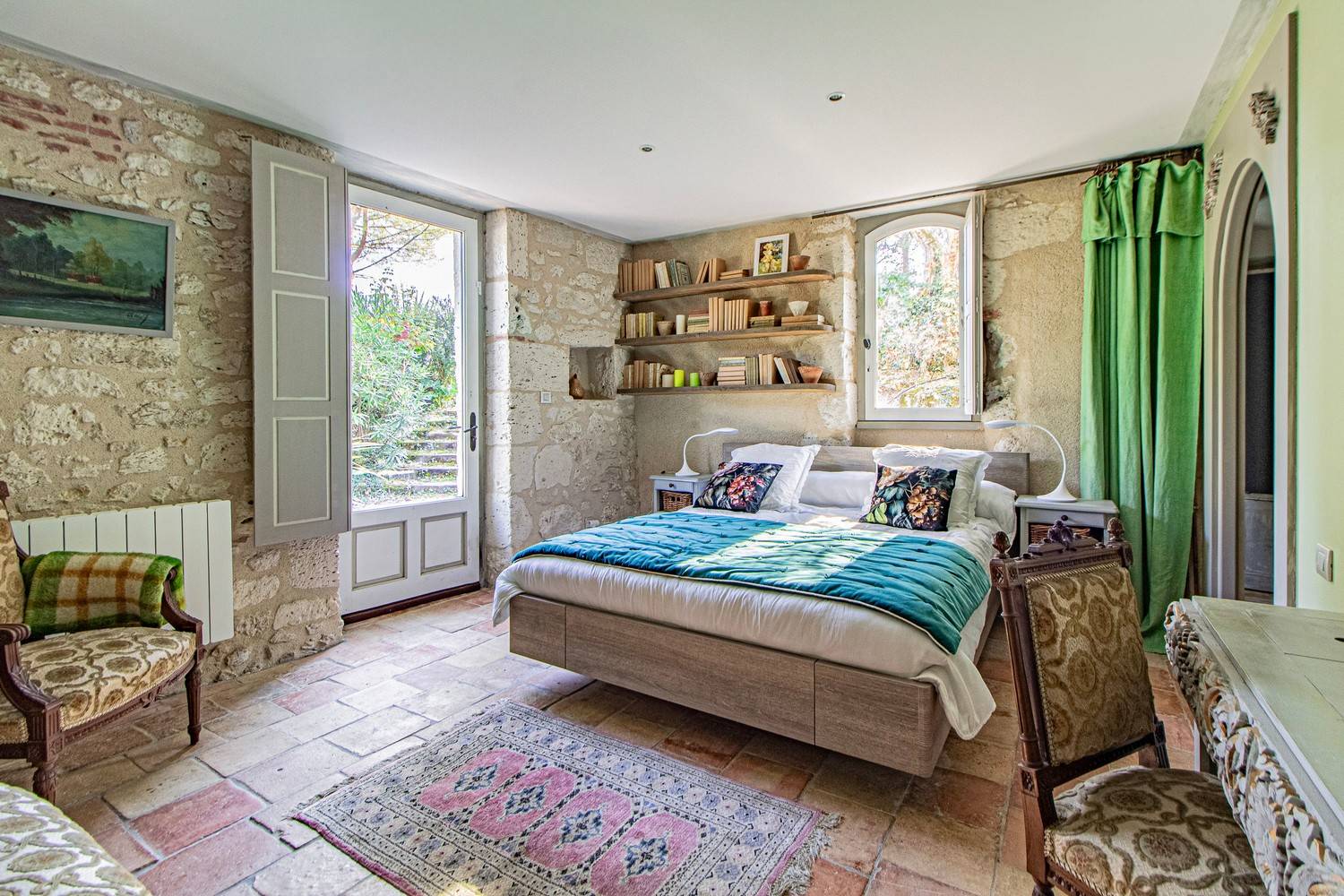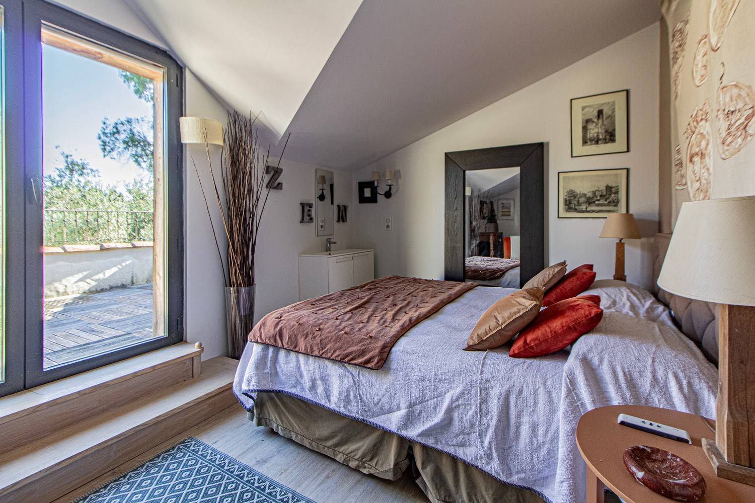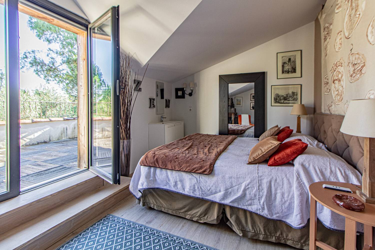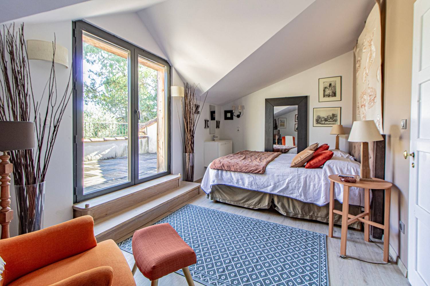 Slaapkamer 3 – Tweepersoonsbed, wastafel en openslaande deuren naar een groot houten terras met uitzicht op de tuin en historische details van het huis.