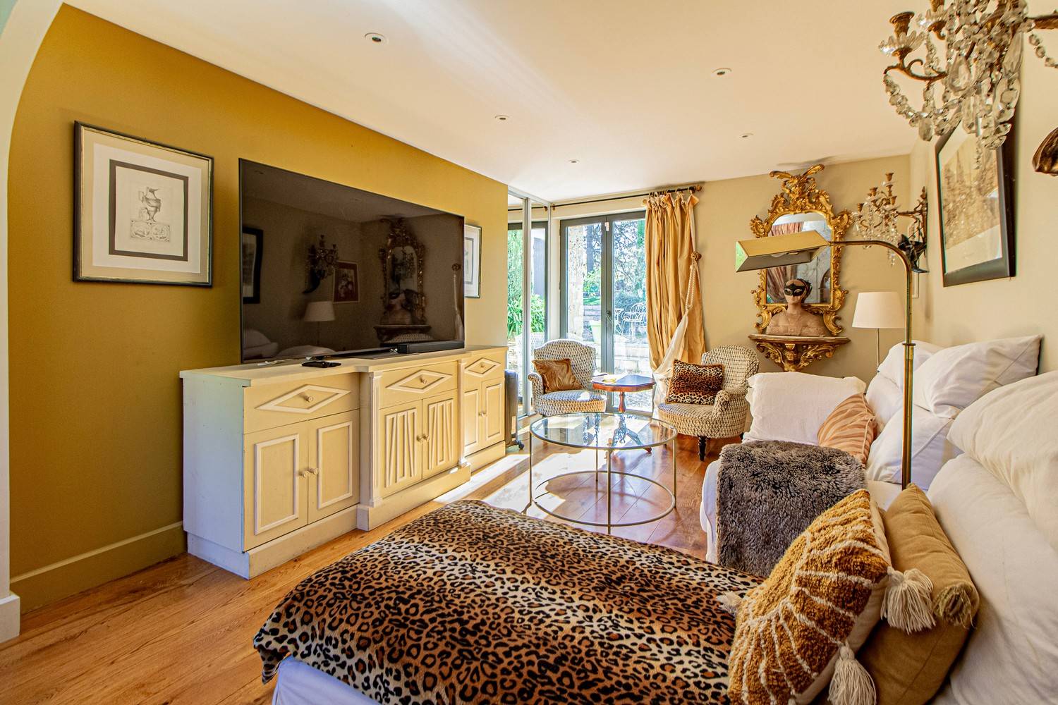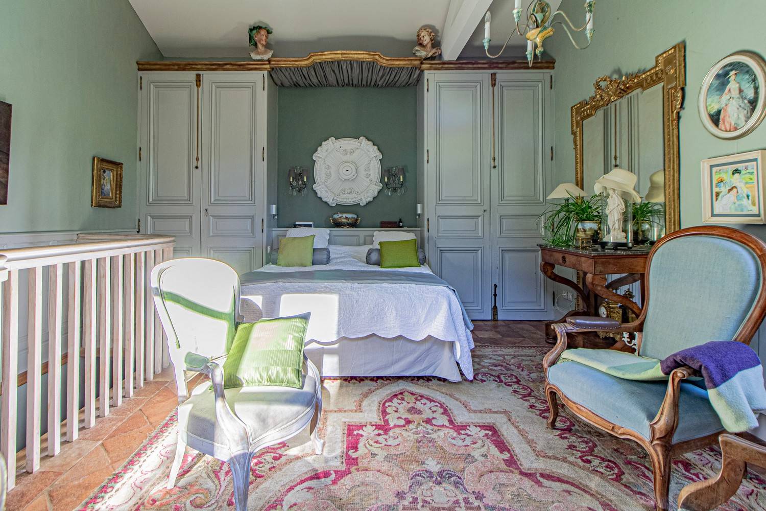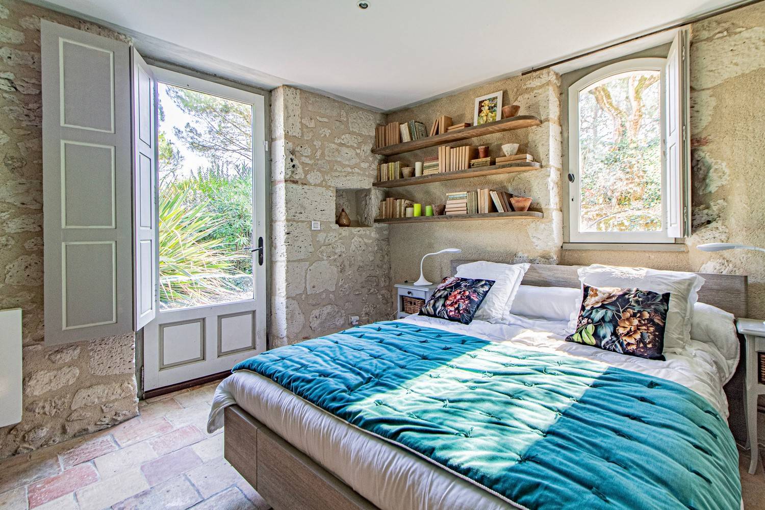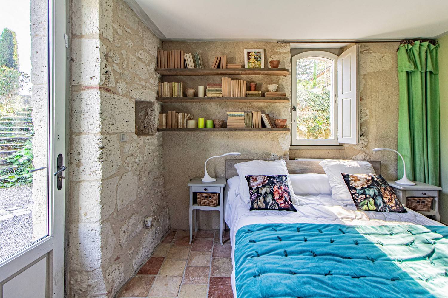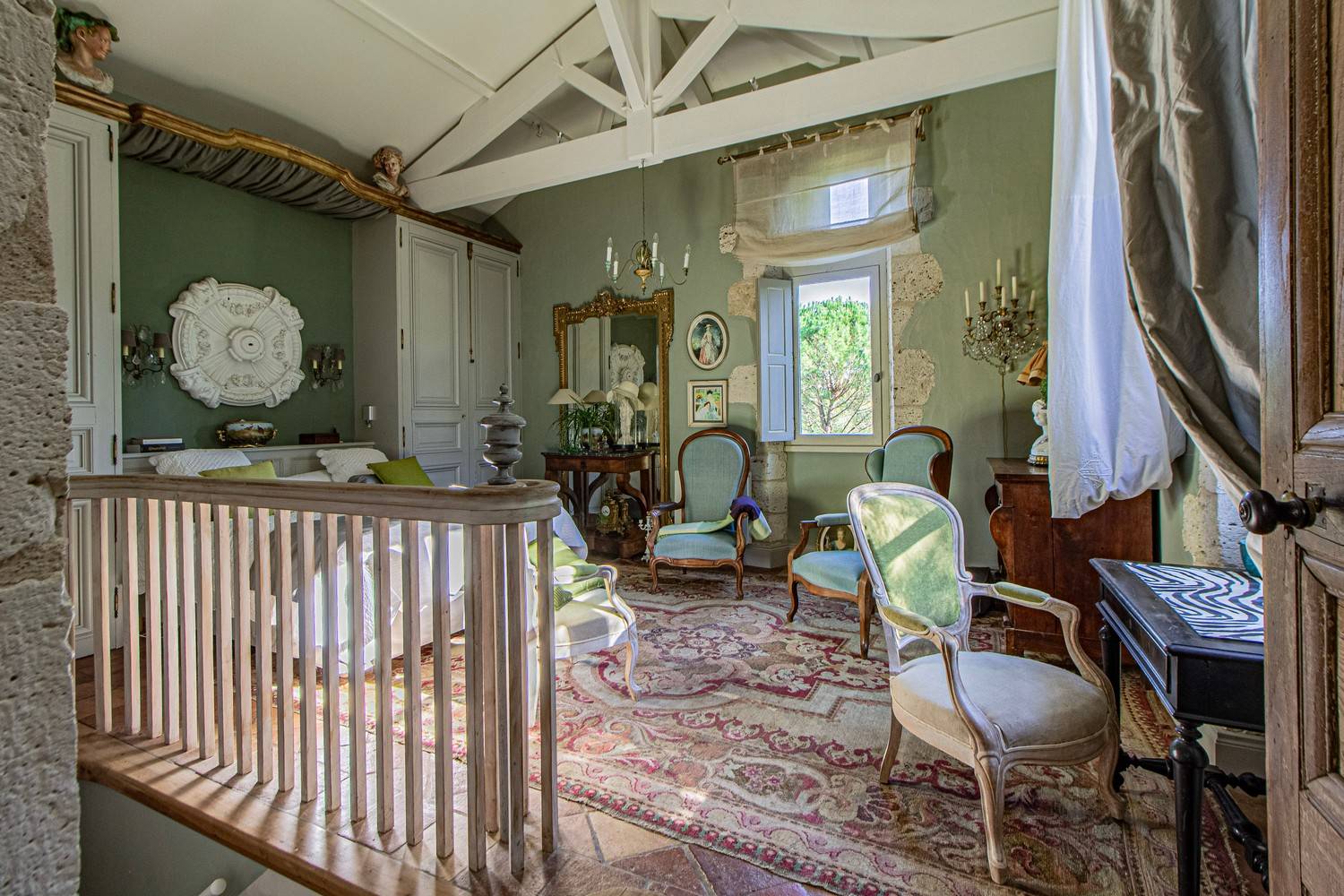 Slaapkamer 3 – Tweepersoonsbed, wastafel en openslaande deuren naar een groot houten terras met uitzicht op de tuin en historische details van het huis.