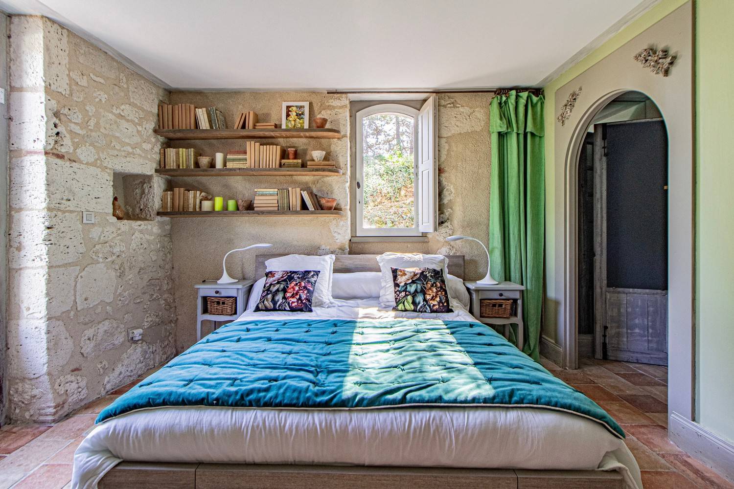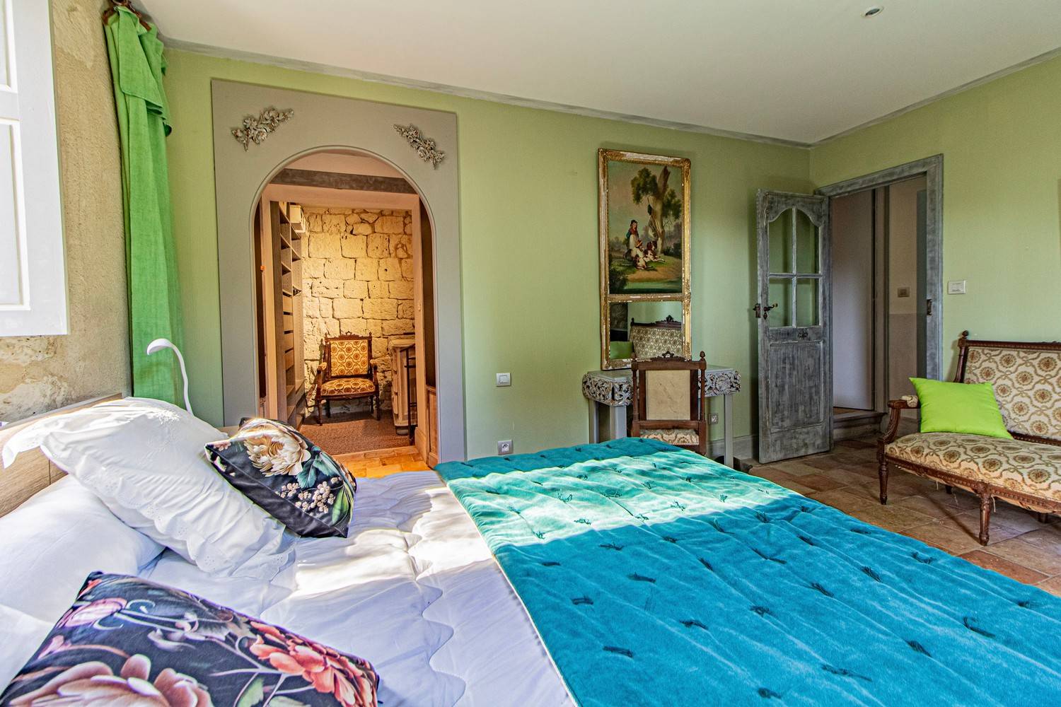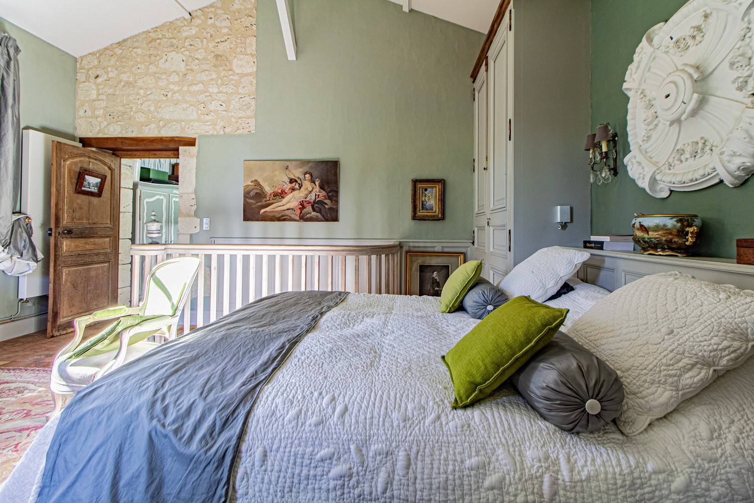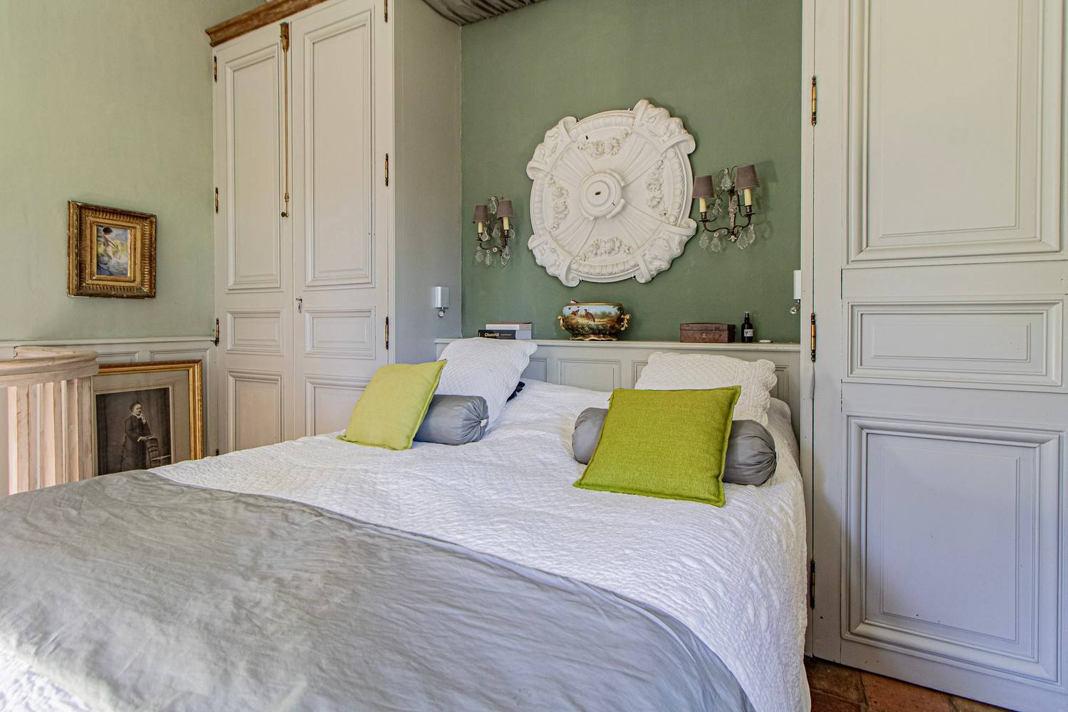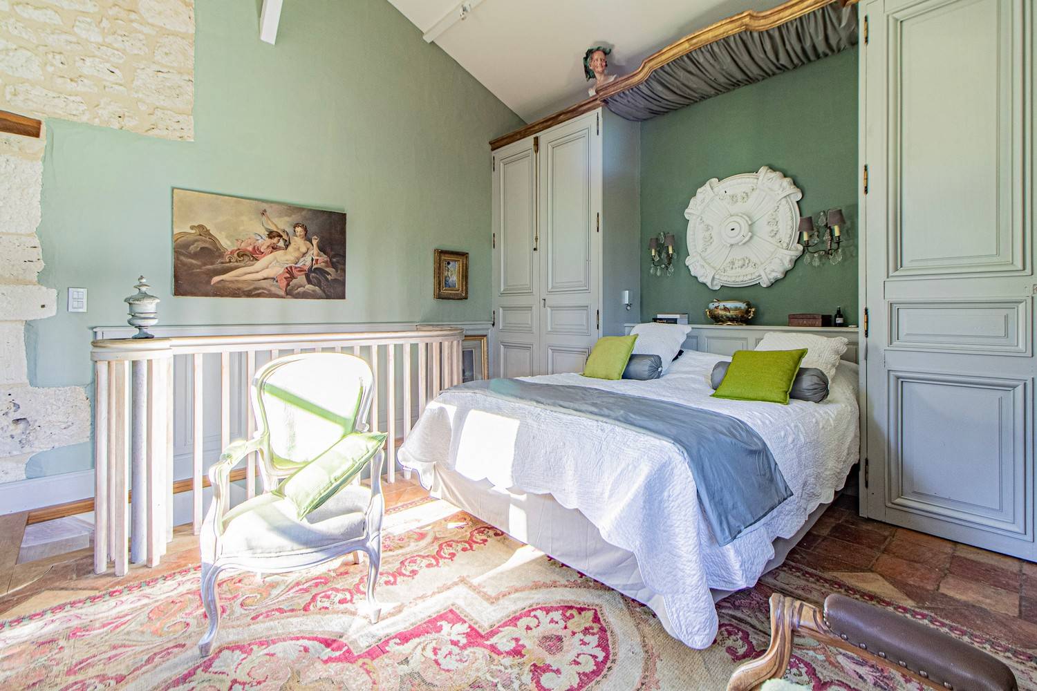 Slaapkamer 3 – Tweepersoonsbed, wastafel en openslaande deuren naar een groot houten terras met uitzicht op de tuin en historische details van het huis.